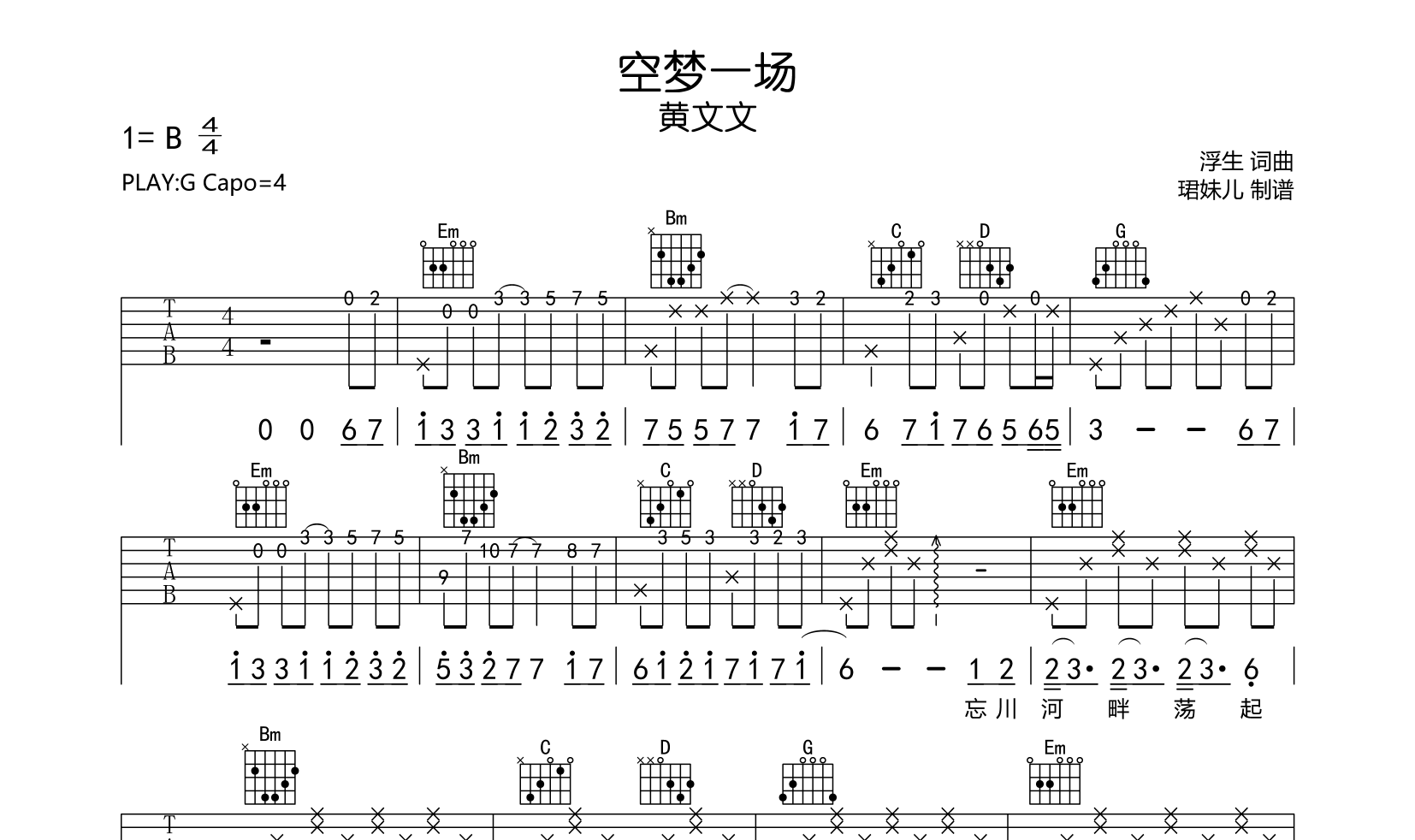 空梦一场吉他谱 - 黄文文 - G调吉他弹唱谱