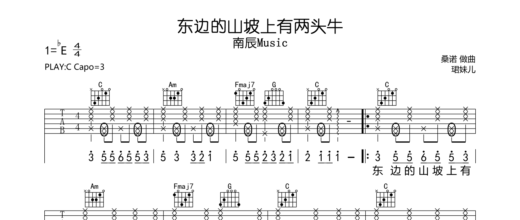 东边的山坡上有两头牛吉他谱 - 南辰Music - C调吉他弹唱谱
