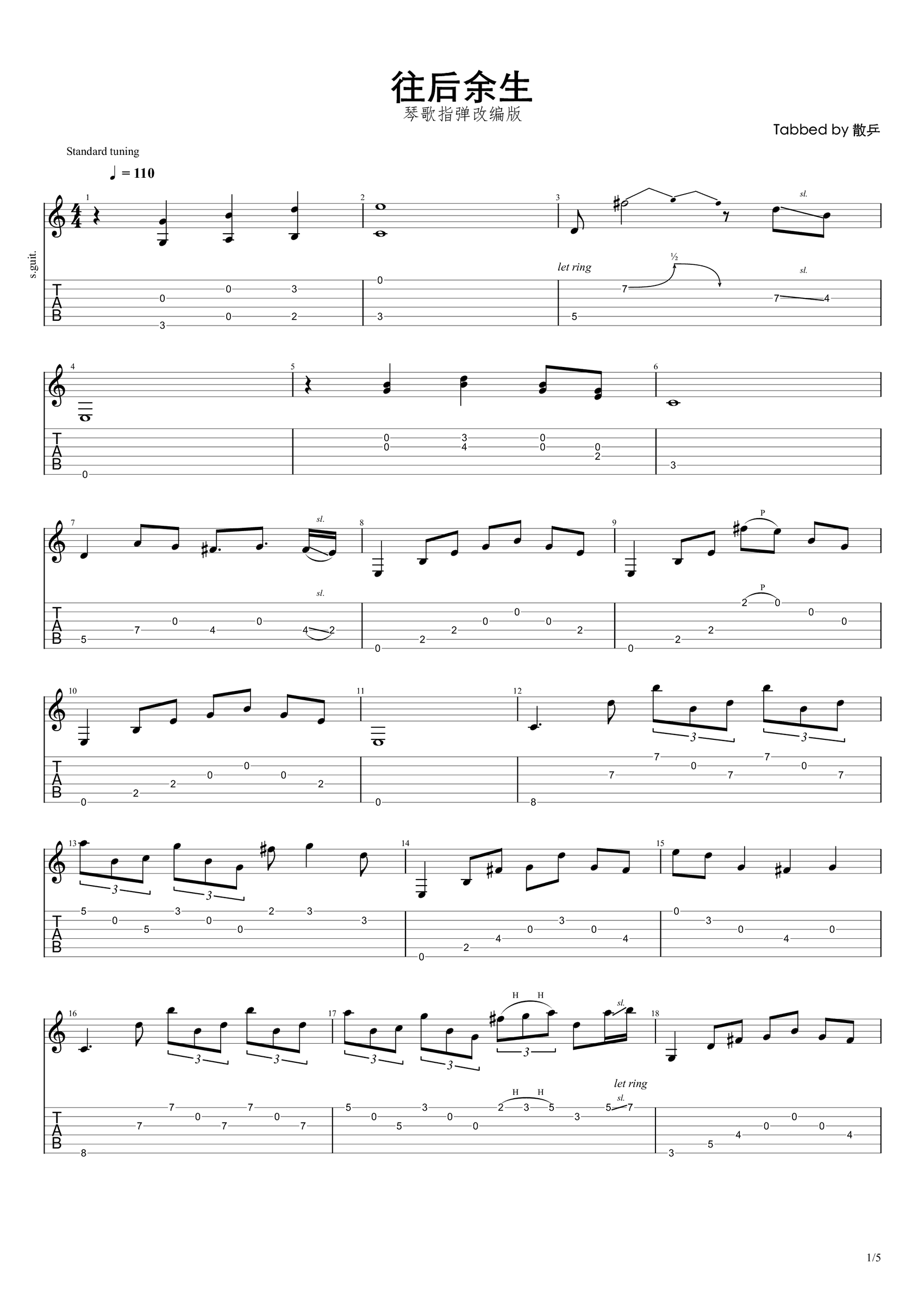 曲谱介绍: 往后余生吉他指弹谱,马良的一首网络热门歌曲改编,《往后余生》吉他独奏谱,琴歌老师指弹版本,完整编配共五张高清图片谱。