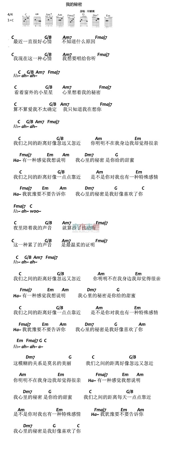 曲谱介绍: 《我的秘密》吉他谱原调C调,不使用变调夹。这首歌曲使用了八个简单的和弦,使得新手能很快的掌握并演唱。这首歌曲难的部分在在于唱,就像邓紫棋的其他歌曲一样,这个才女的演绎劝退了一群人的翻唱想法。 《我的秘密》吉他弹唱教学示范