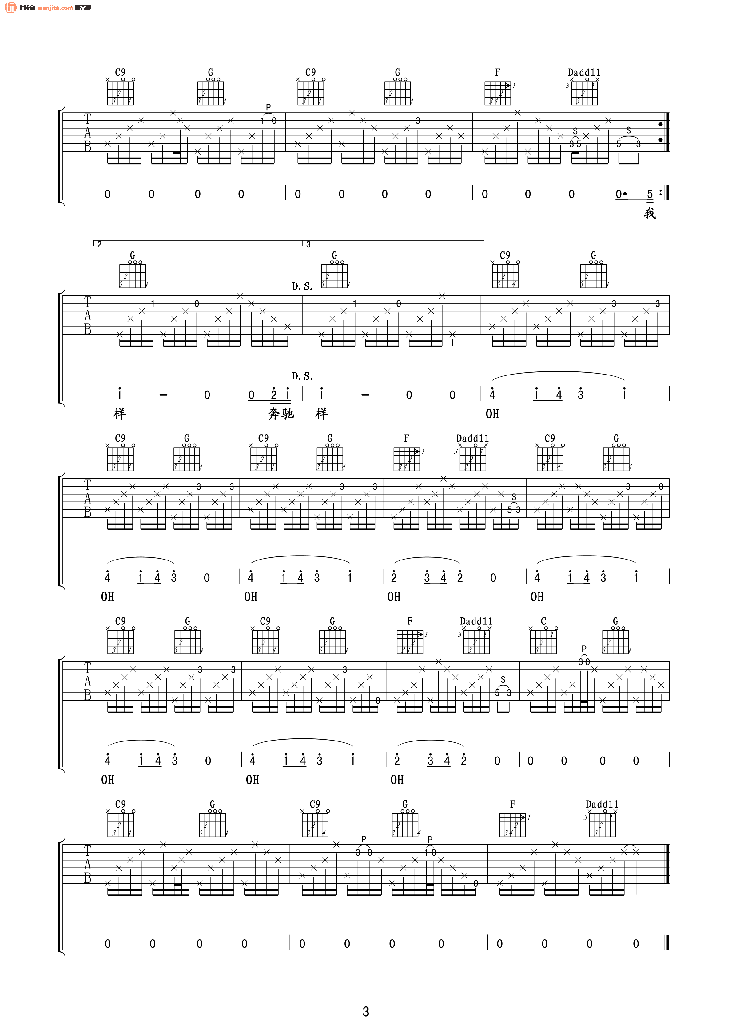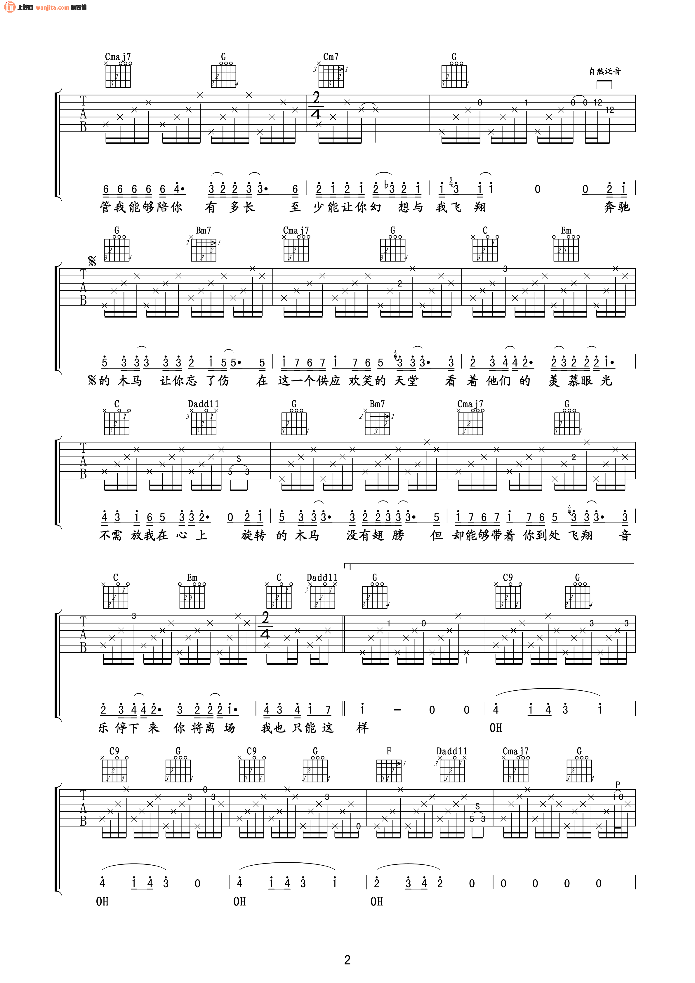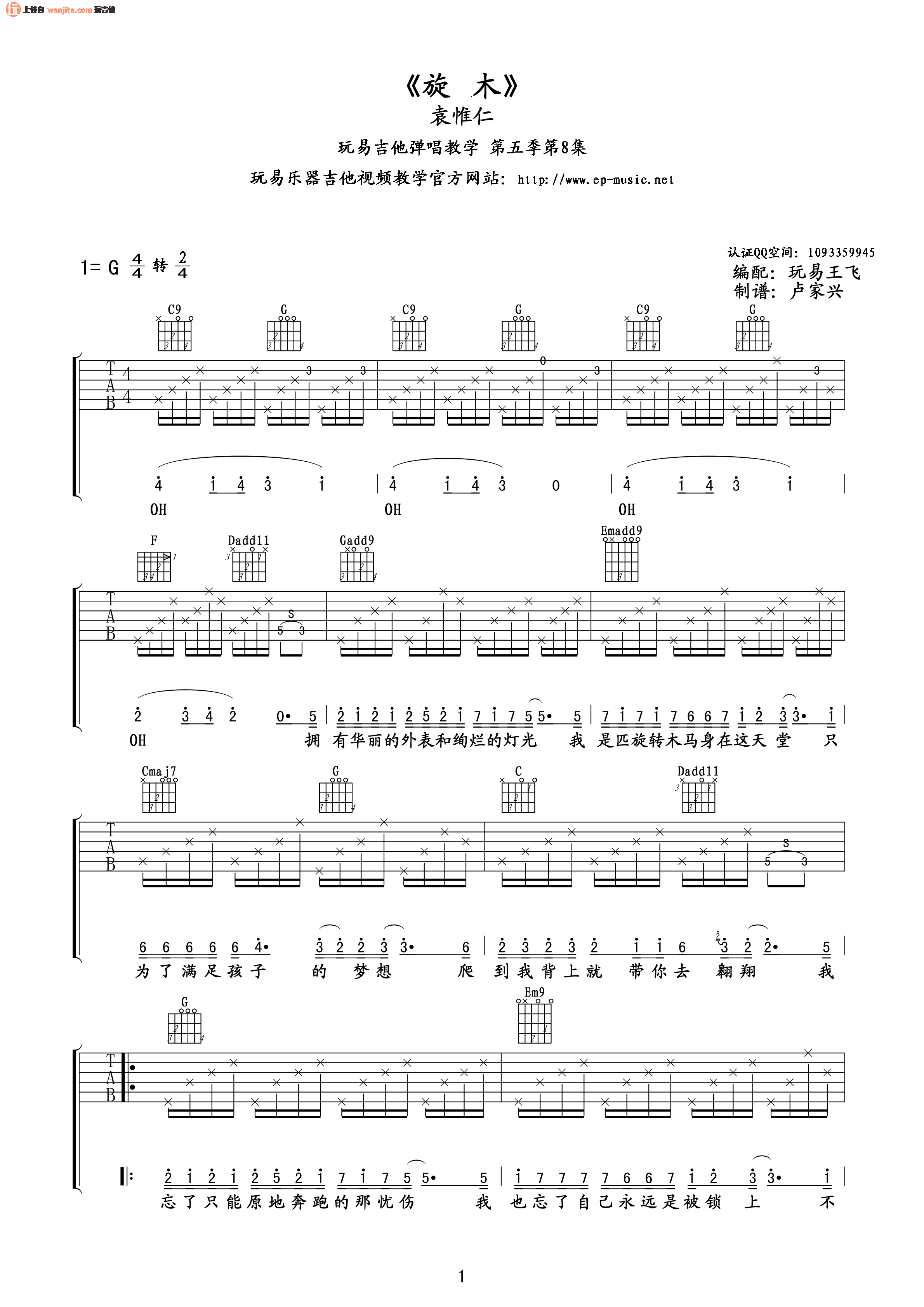 曲谱介绍: 旋木吉他谱,总共3张高清图片谱,原调为G调,节拍4/4转2/4,不使用变调夹,弹唱难度初级。
