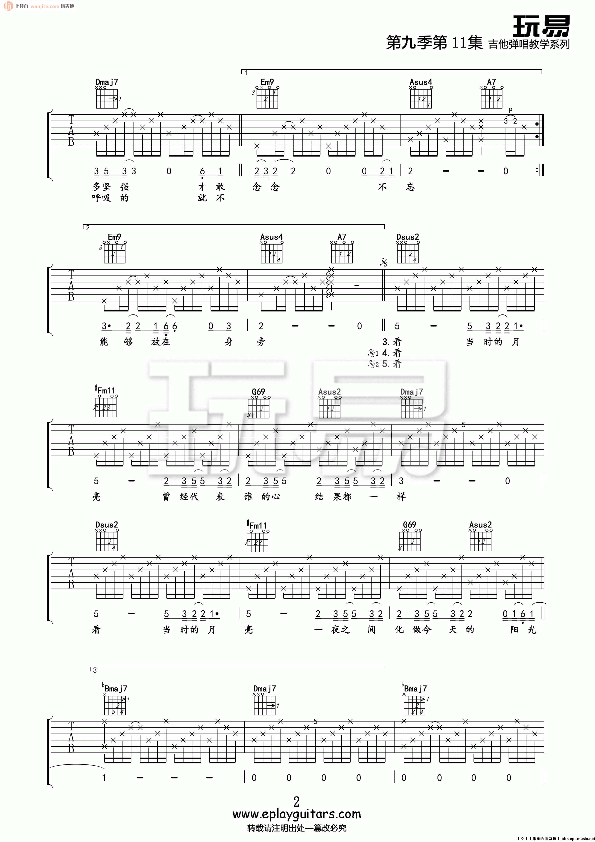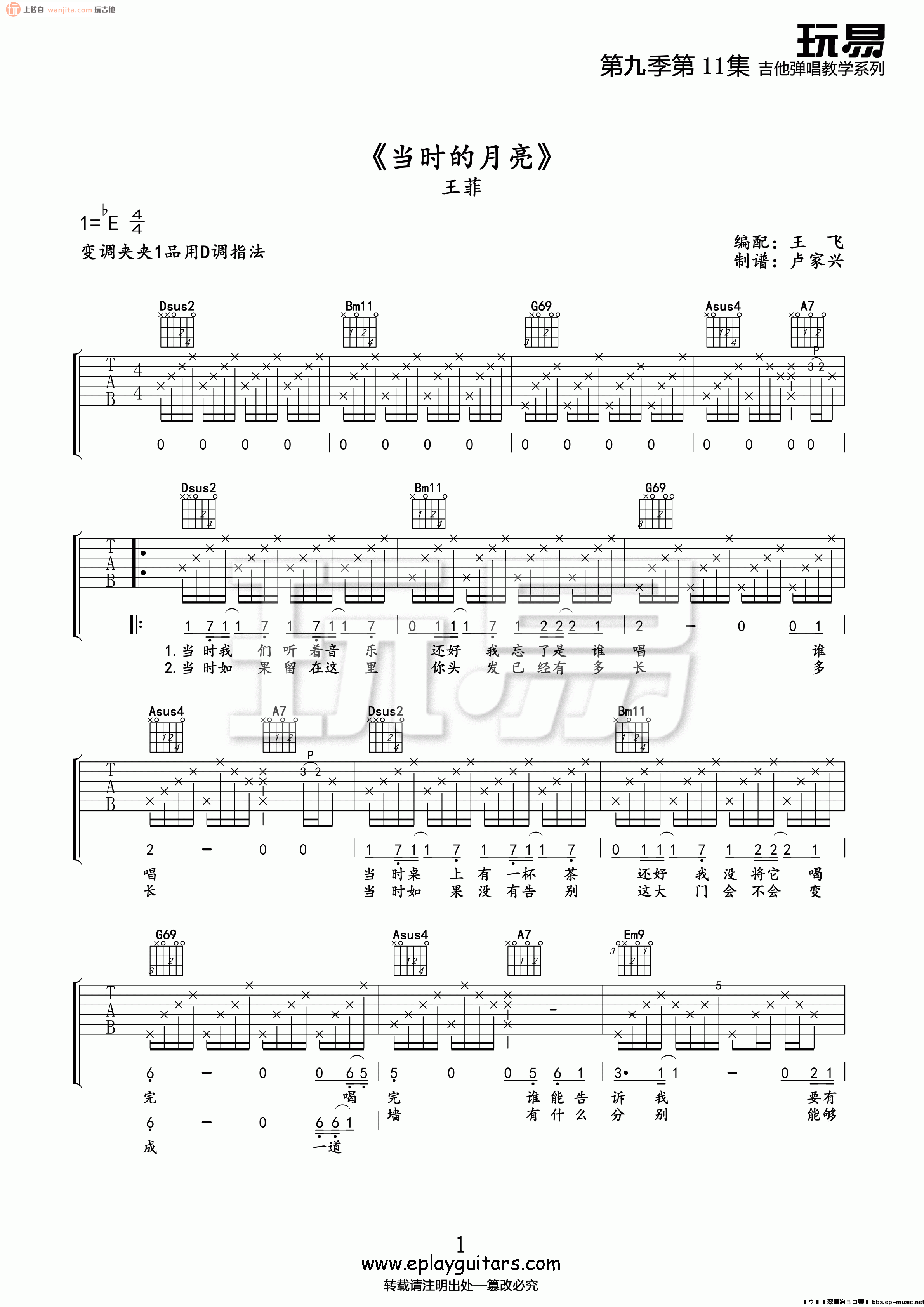 曲谱介绍: 王菲当时的月亮吉他谱,由玩易吉他编配,原调bE,采用D调,变调夹推荐夹1品处弹唱本谱,整体还原度较高,弹唱难度不算太大,节拍较快,建议提前按小节练好节拍的手感,玩吉他网站整理提供上传分享