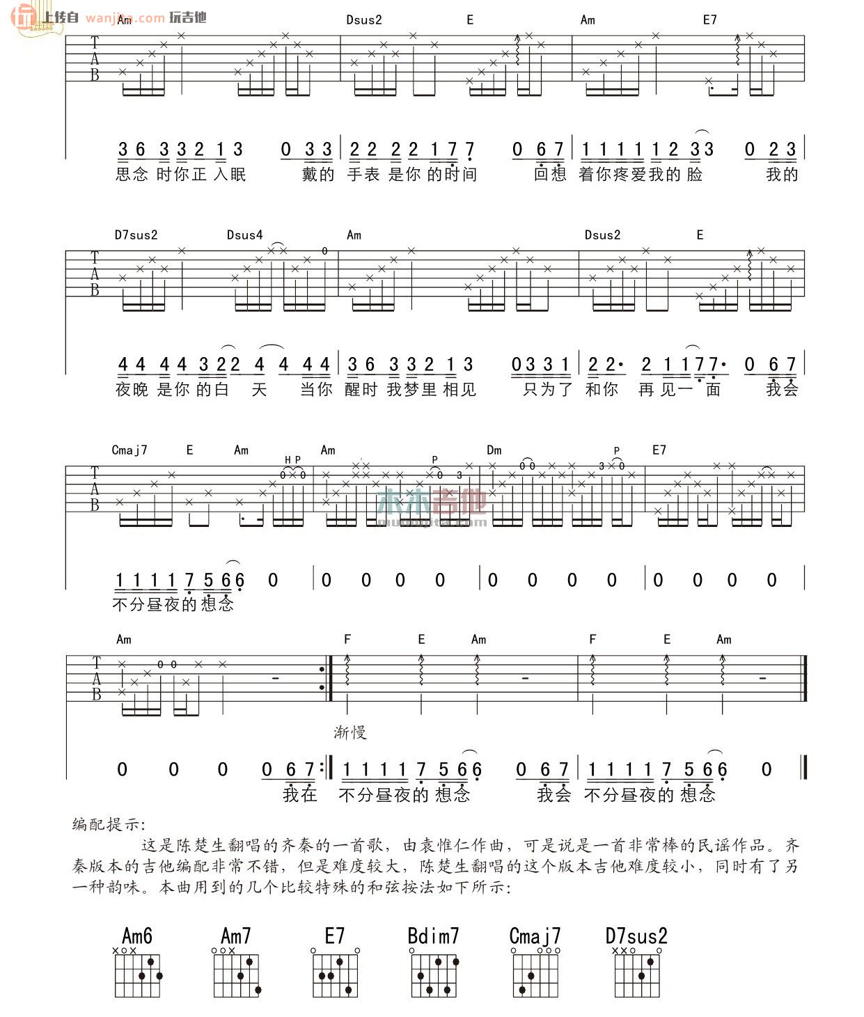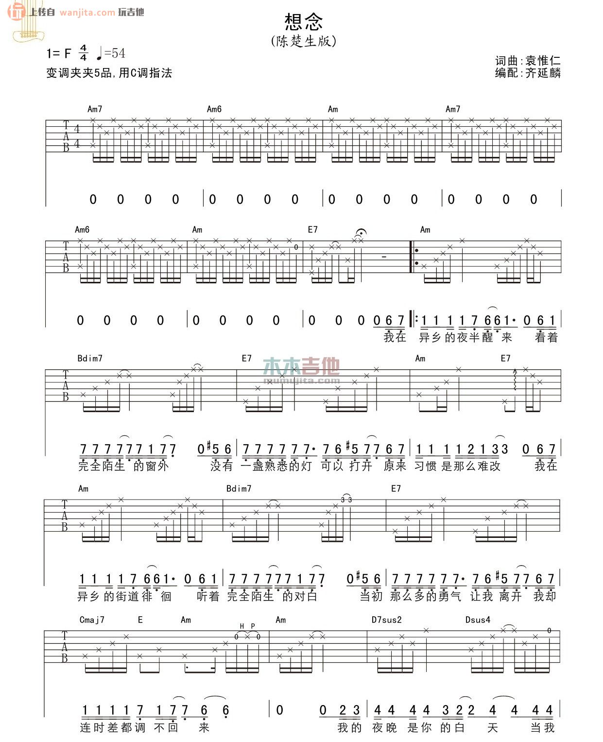 曲谱介绍: 想念吉他谱,陈楚生演唱,来自齐延麟的制谱,总共2张高清图片谱,原调为F调,用C调指法编配,节拍4/4,速度每分钟54BPM,弹唱建议使用变调夹夹5品,弹唱难度初级。