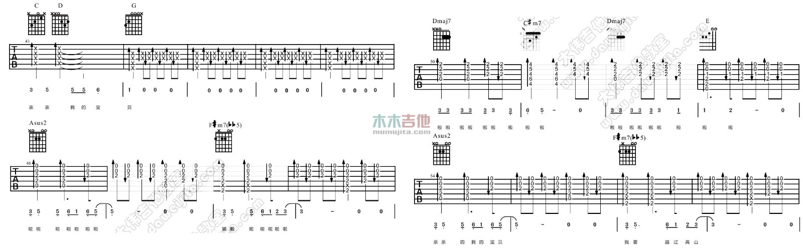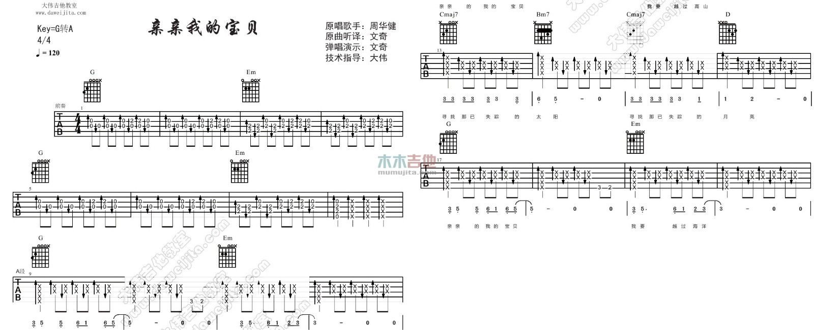 曲谱介绍: 亲亲我的宝贝吉他谱,总共4张高清图片谱,原调为G调转A调,节拍4/4,速度每分钟120BPM,不使用变调夹,弹唱难度初级。