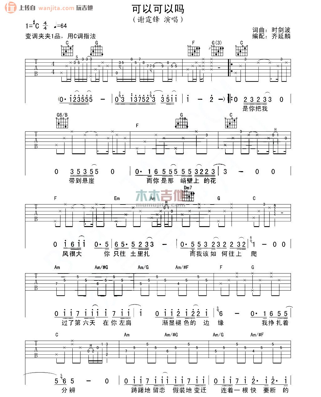 曲谱介绍: 可以可以吗吉他谱,总共2张高清图片谱,原调为升C调,用C调指法编配,节拍4/4,速度每分钟64BPM,弹唱建议使用变调夹夹1品,弹唱难度初级。