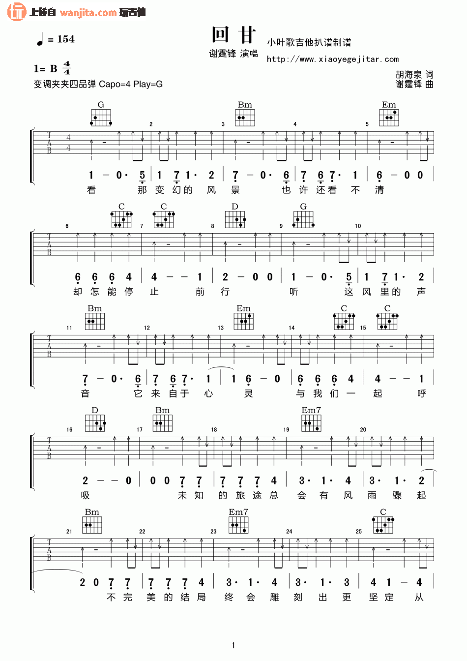 曲谱介绍: 谢霆锋回甘吉他谱,小叶歌制谱,总共3张高清图片谱,原调为降D调,用G调指法编配,节拍4/4,速度每分钟64BPM,弹唱建议使用变调夹夹1品,弹唱难度初级。
