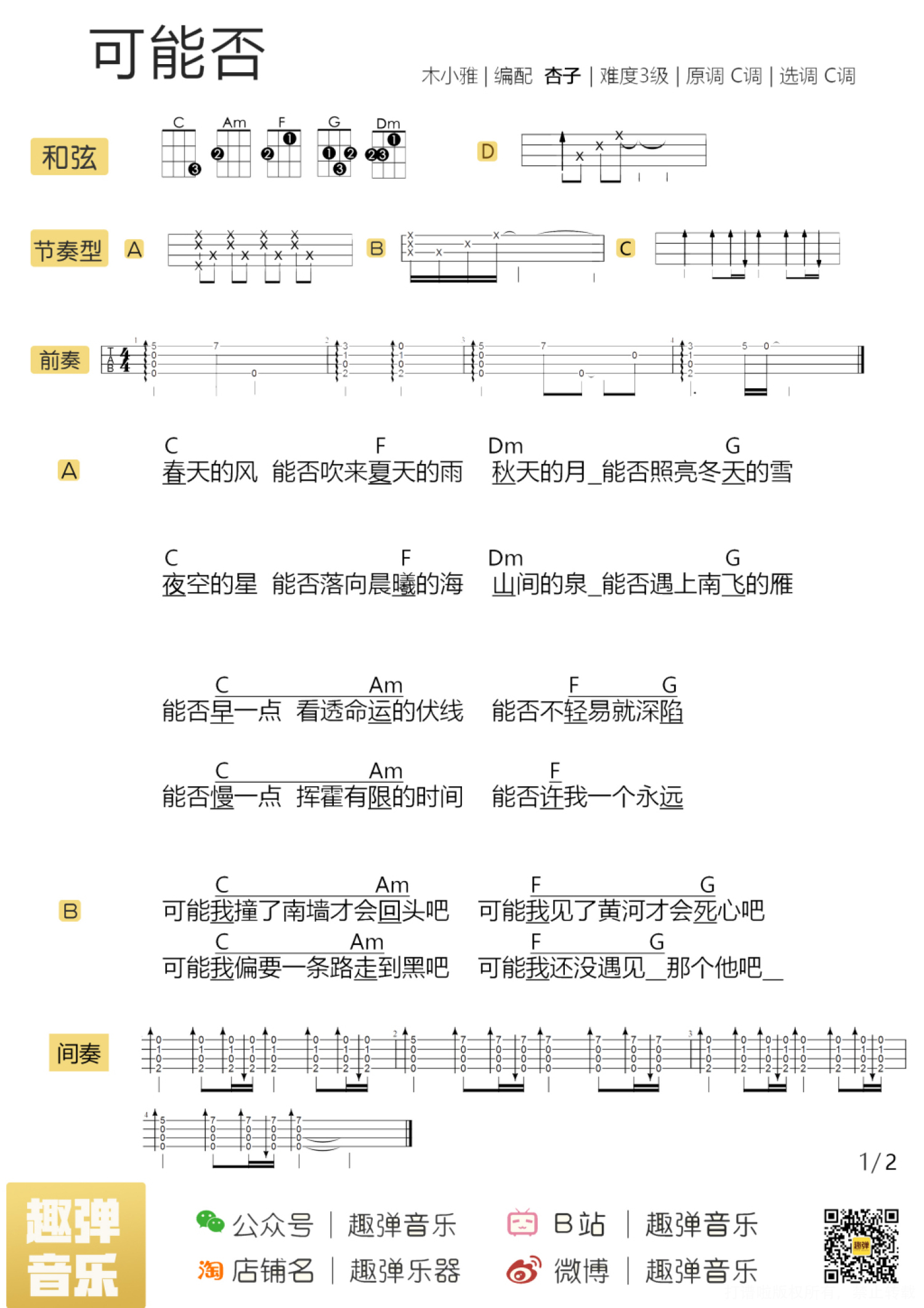 曲谱介绍: Aloha~ 之前出过「可能否」的谱子 今天杏子老师就来教大家 弹唱这首歌曲~ 歌曲的旋律干净 加上杏子老师温柔的声音 适合循环一整晚 来感受其中的情绪~ 有关歌曲 这首歌最初的灵感源自诗人张枣的一句诗:“只要想起一生中后悔的事,梅花便落满了南山”。 枝头的梅花凋零,铺满南山,原本鲜活的颜色也会因为失去了生命的来源而逐渐暗淡。 在《可能否》这首歌里,木小雅表达了自己对人生相遇与错过的态度。 歌词中描述着那些错过的迷惘:“能否早一点,相信年少的誓言,能否不轻易说再见。 木小雅的声音,干净、清冽,让人感到舒服。她轻轻的唱着,把自己的思考,自己的情绪都揉到声音里。 每个人都会经历遇见或是错过,也会有充满个性的坚持和执拗。面对那些未知的“可能”,我们仍应该选择期待。   歌曲教学   弹唱曲谱