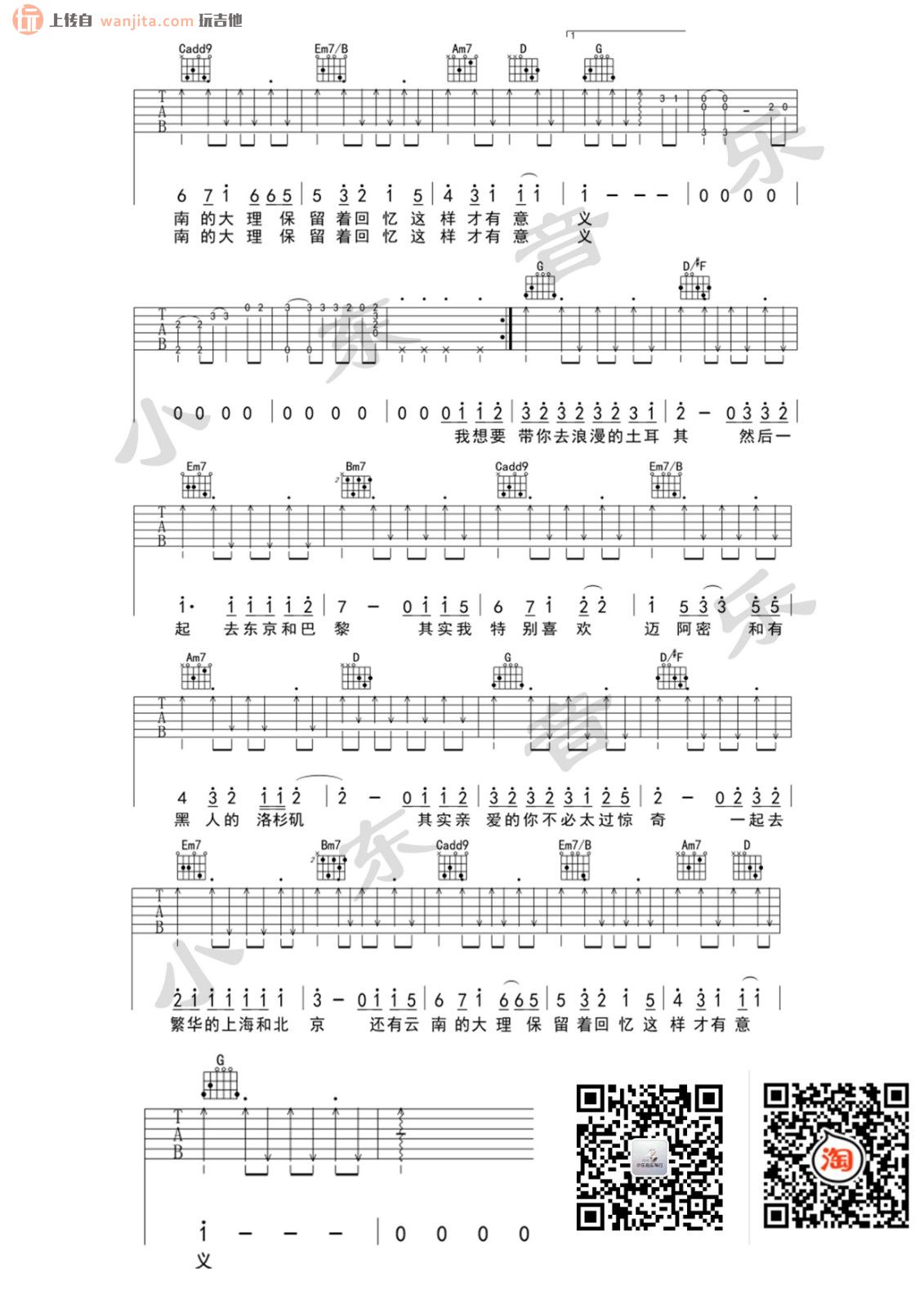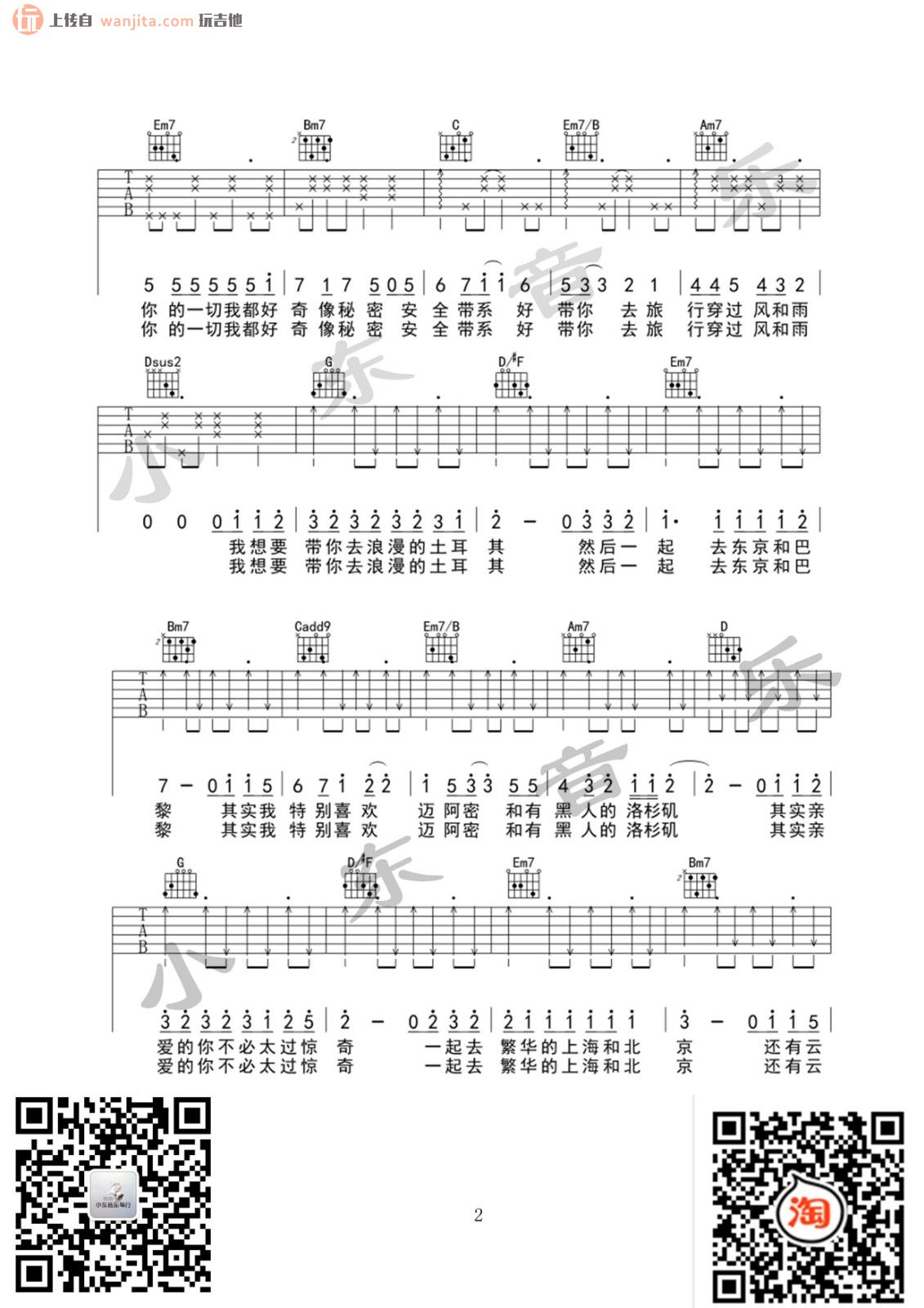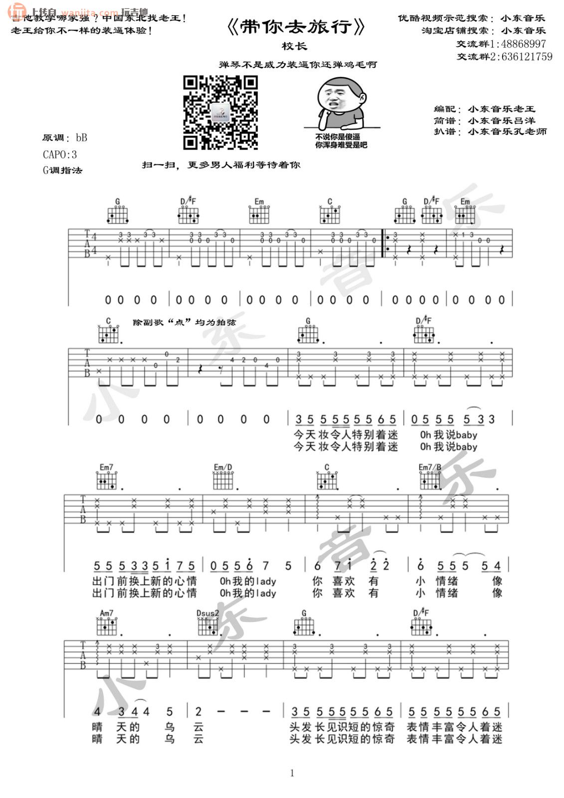 曲谱介绍: 抖音歌曲《带你去旅行》吉他弹唱谱,共有3张高清图谱。
