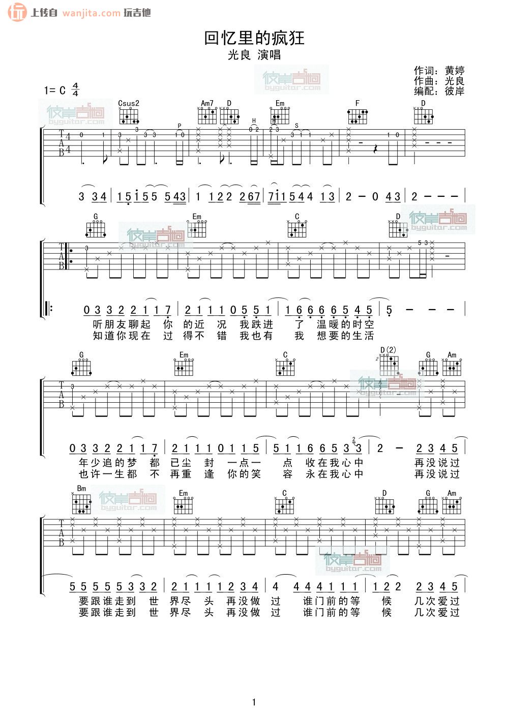 曲谱介绍: 《回忆里的疯狂》吉他谱,总共3张高清图片谱,选用C调指法,节拍4/4拍,不使用变调夹,弹唱难度初级。
