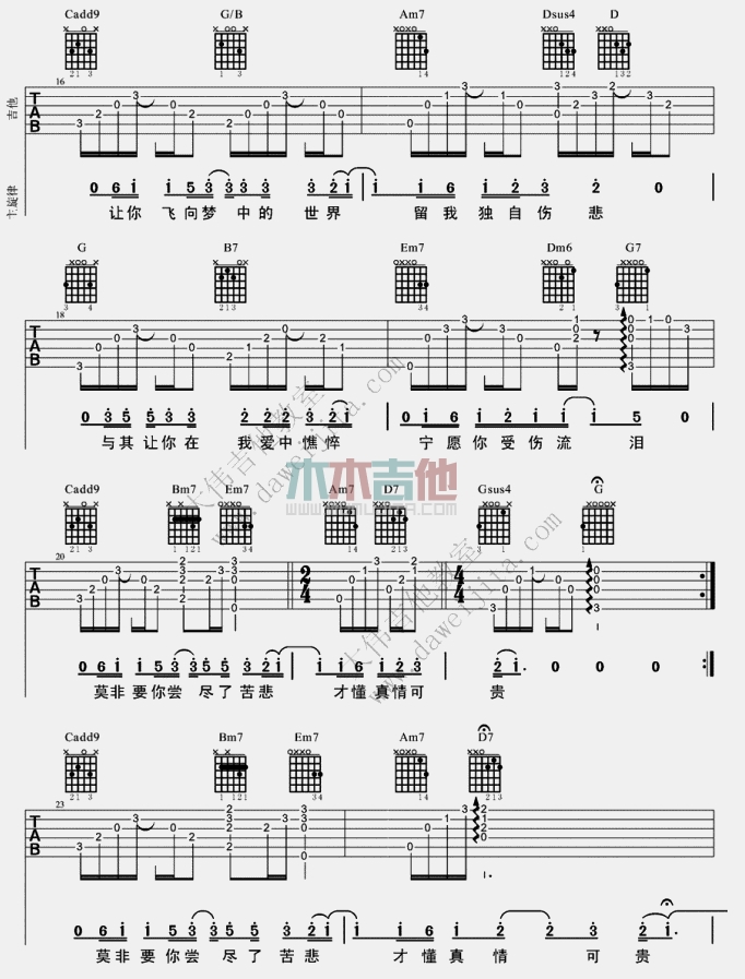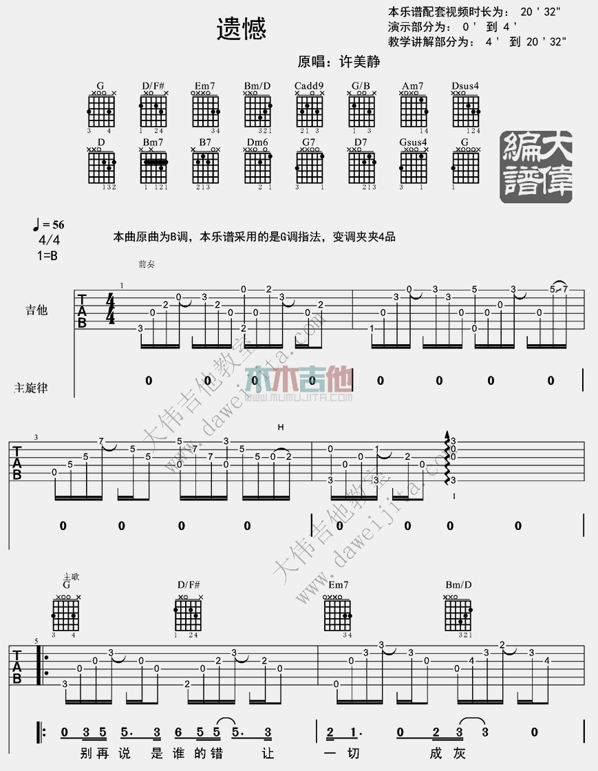 曲谱介绍: 遗憾吉他谱是演绎的一首许美静的经典的伤感爱情歌曲,本曲原调为B调,本谱采用的是G调指法,变调夹夹4品,由大伟吉他提供编配曲谱,玩吉他整理上传。 《遗憾》吉他弹唱视频