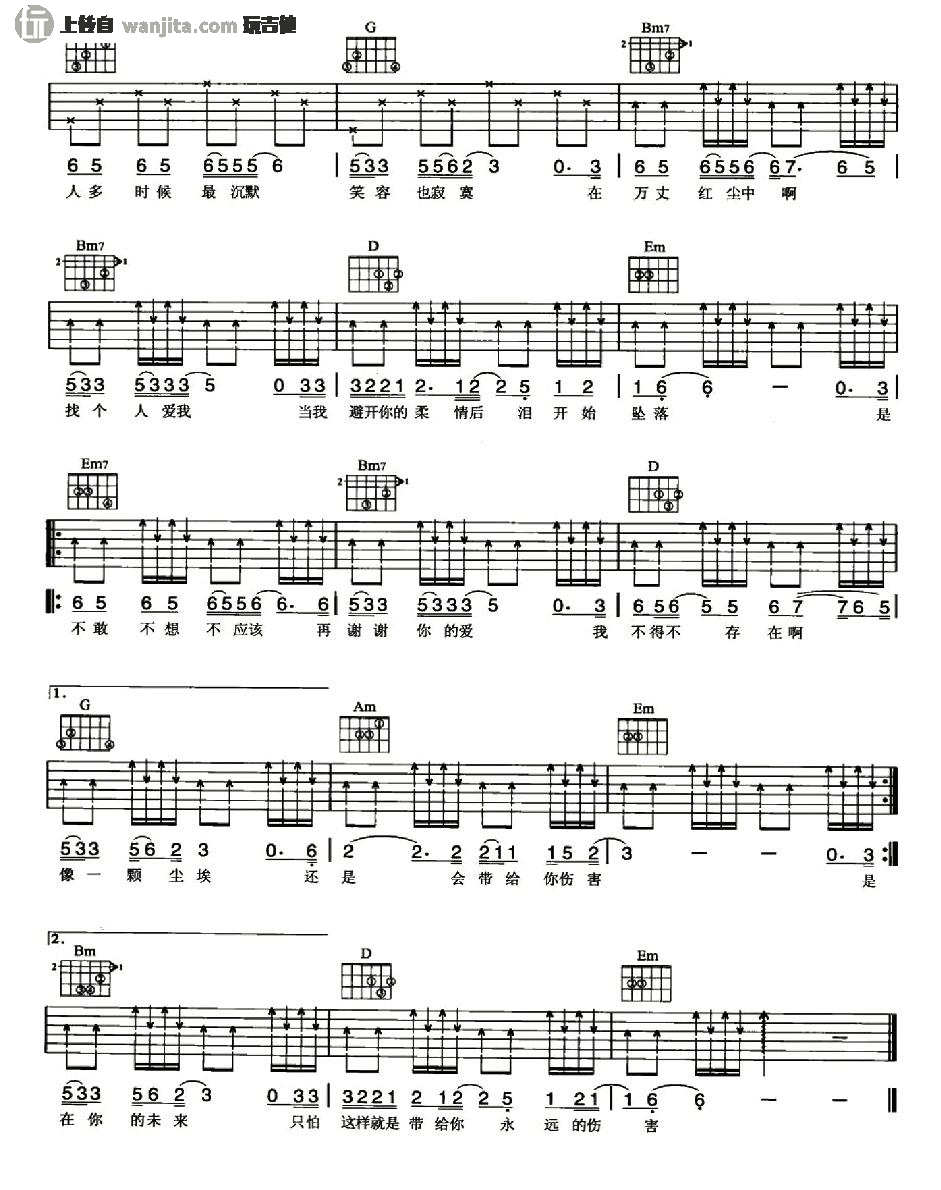 曲谱介绍: 《谢谢你的爱》吉他谱,总共2张高清图片谱,原调为G调,节拍4/4拍,建议不使用变调夹,弹唱难度初级。