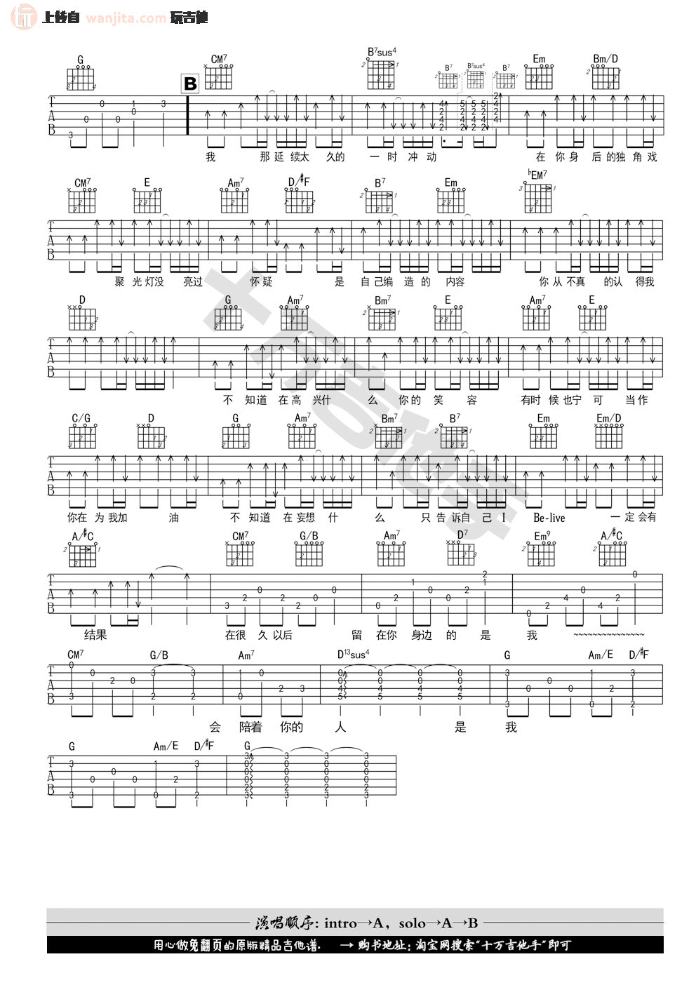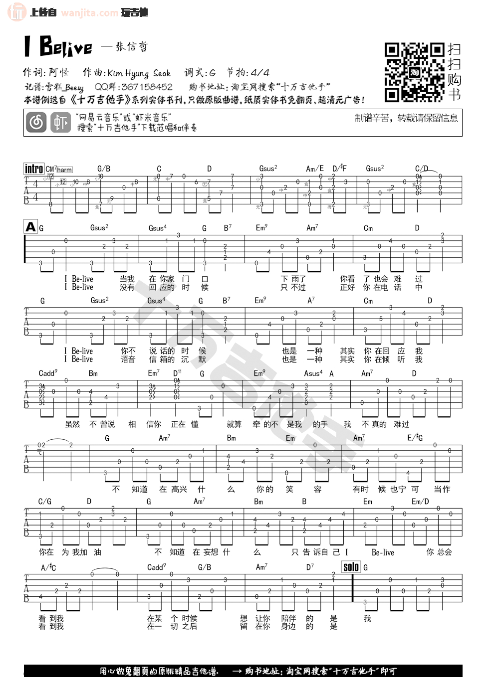 曲谱介绍: 《I Believe》吉他谱,由十万吉他手制谱,总共2张高清图片谱,原调为G调,节拍4/4拍,建议不使用变调夹,弹唱难度初级。