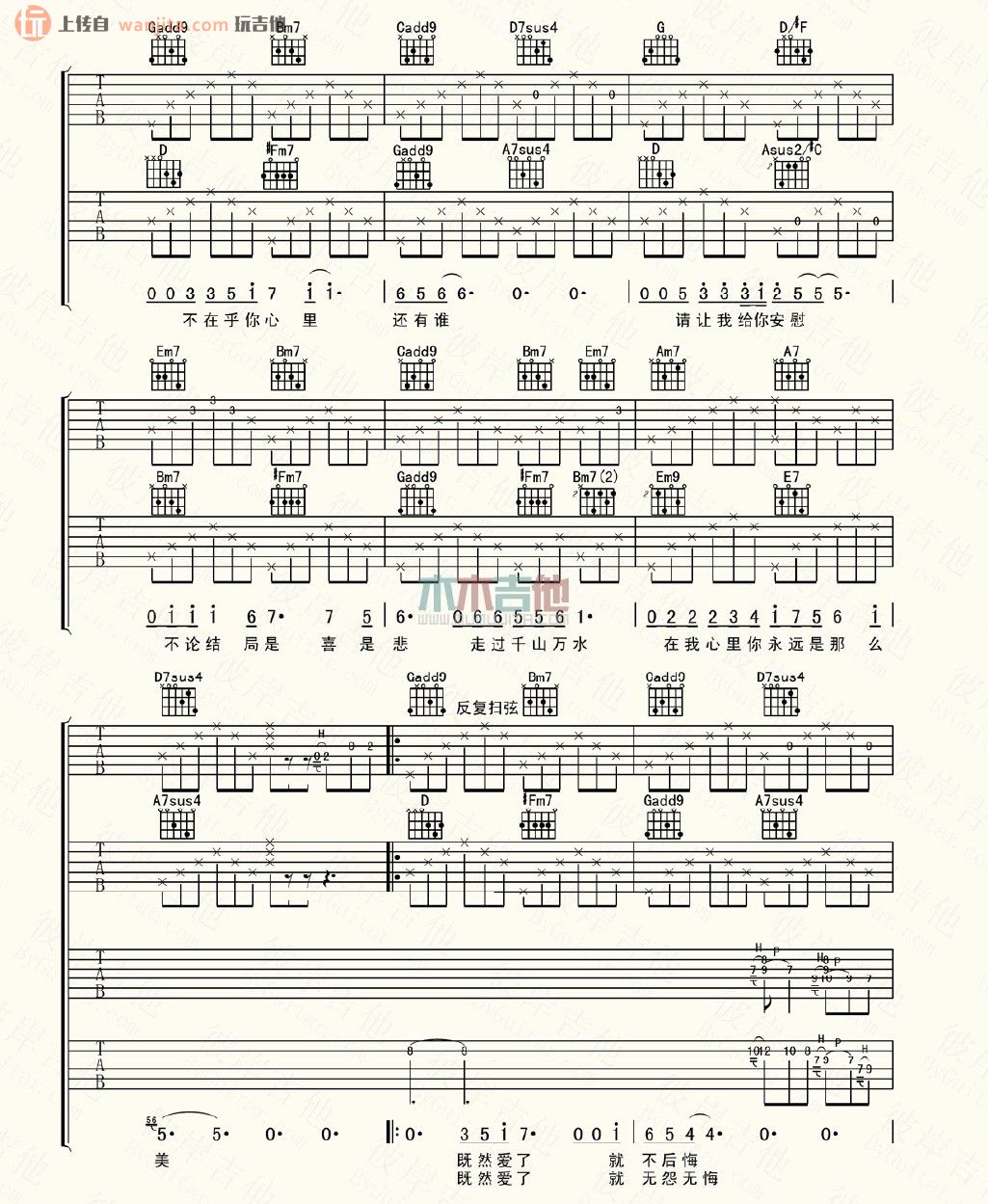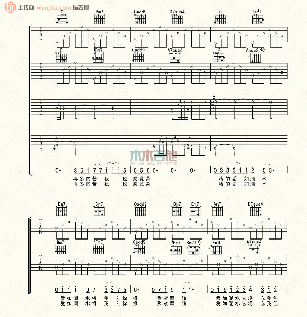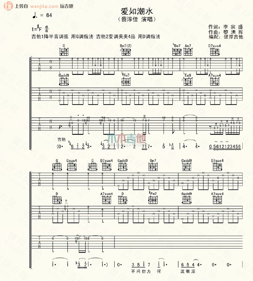 曲谱介绍: 蔡淳佳《爱如潮水》吉他弹唱谱,共有7张高清图谱。