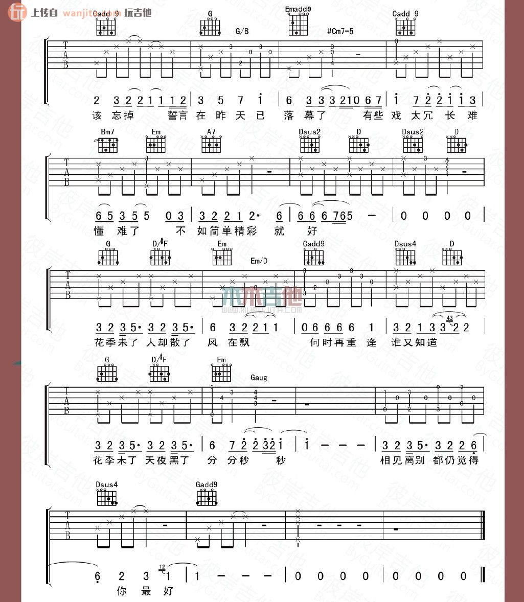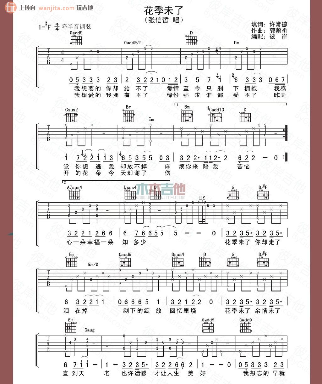 曲谱介绍: 《花季未了》吉他谱,由彼岸吉他制谱,总共2张高清图片谱,原调为升F调,降半音调弦,节拍4/4拍,建议不使用变调夹,弹唱难度初级。