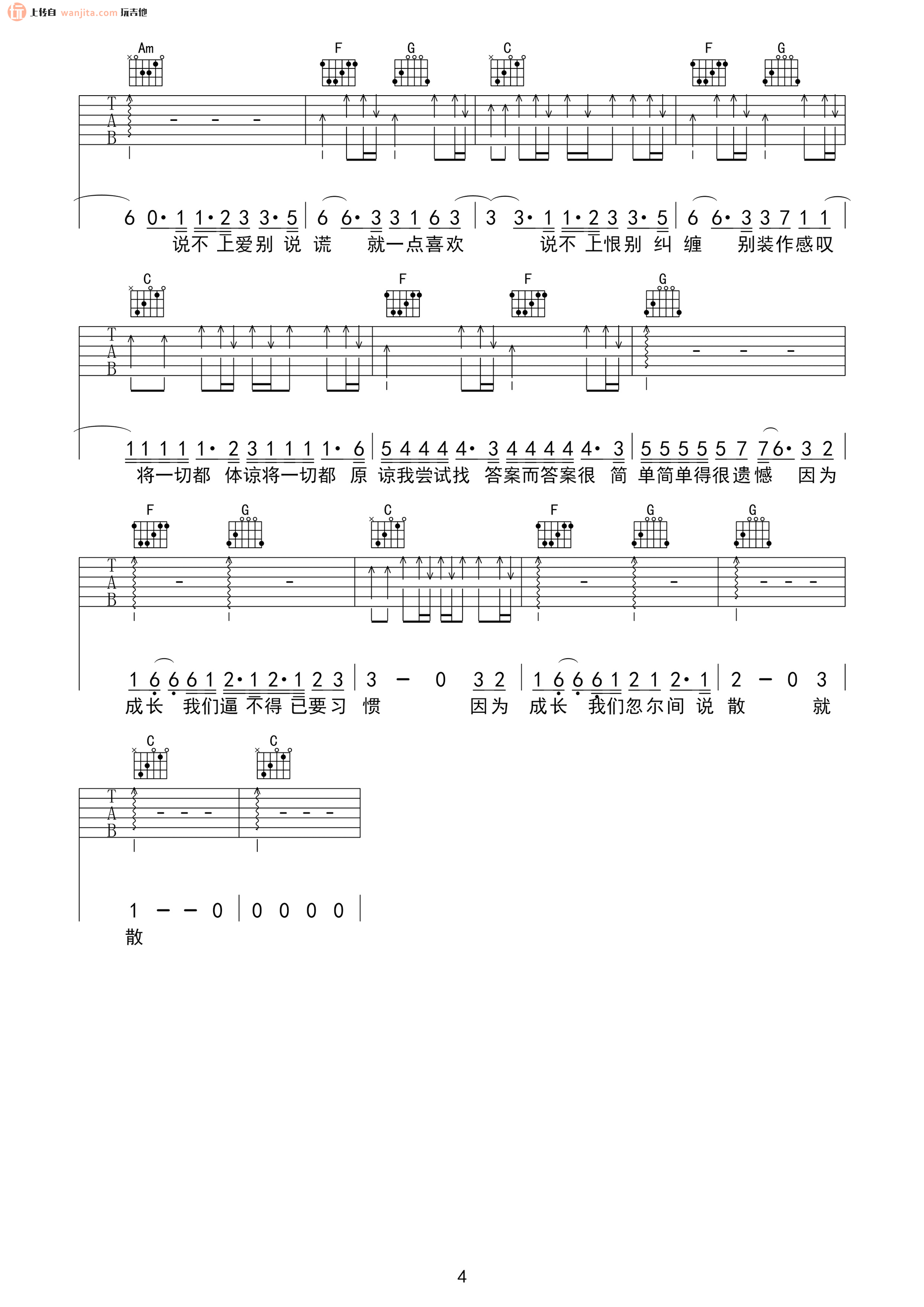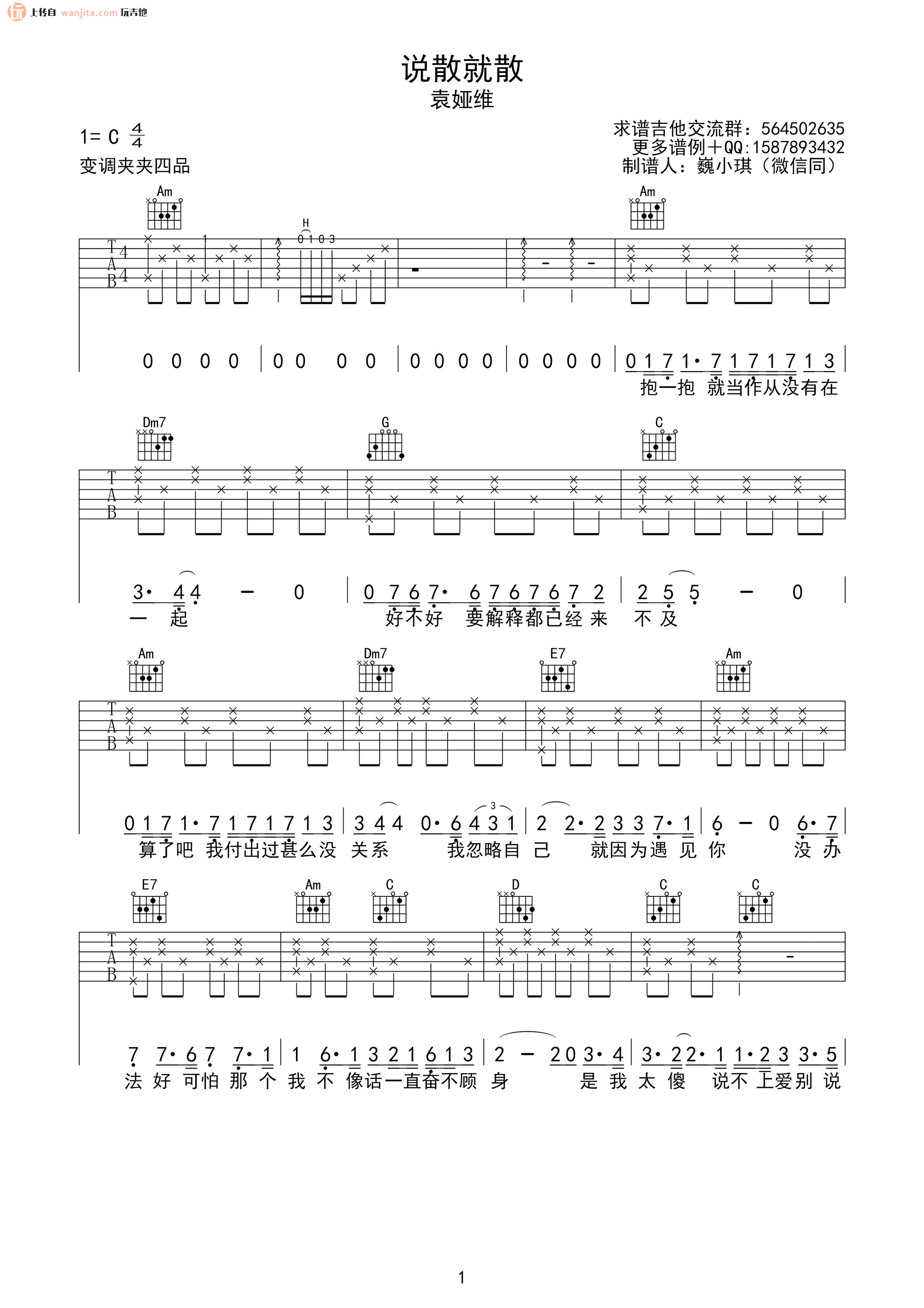 曲谱介绍: 说散就散吉他谱,总共4张高清图片谱,原调是E调,选用C调指法,变调夹夹4品弹唱原调,节拍4/4拍,包含完整的前奏,曲谱弹唱还原度较高,由巍小琪制谱。