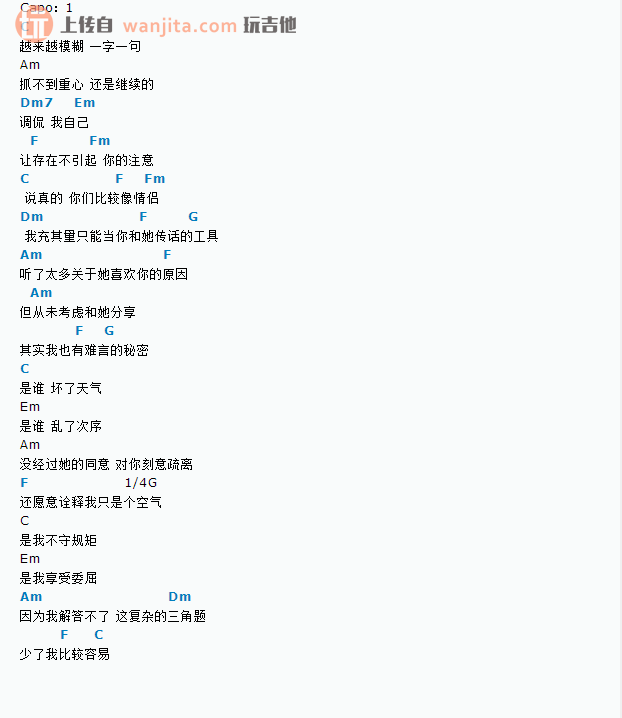 曲谱介绍: 《三角题》吉他谱,总共1张高清图片和弦谱,弹唱建议使用变调夹夹1品,弹唱难度初级。
