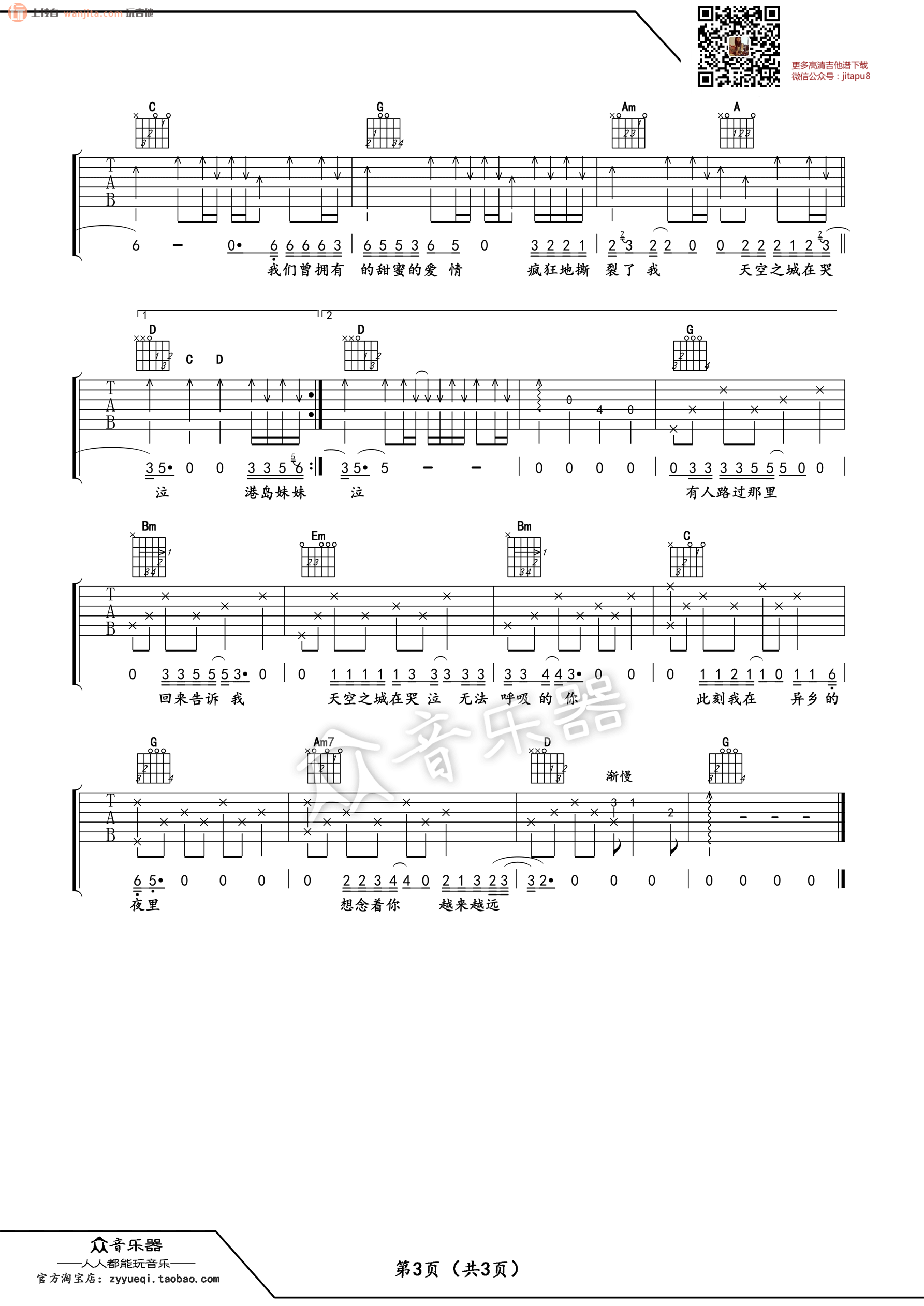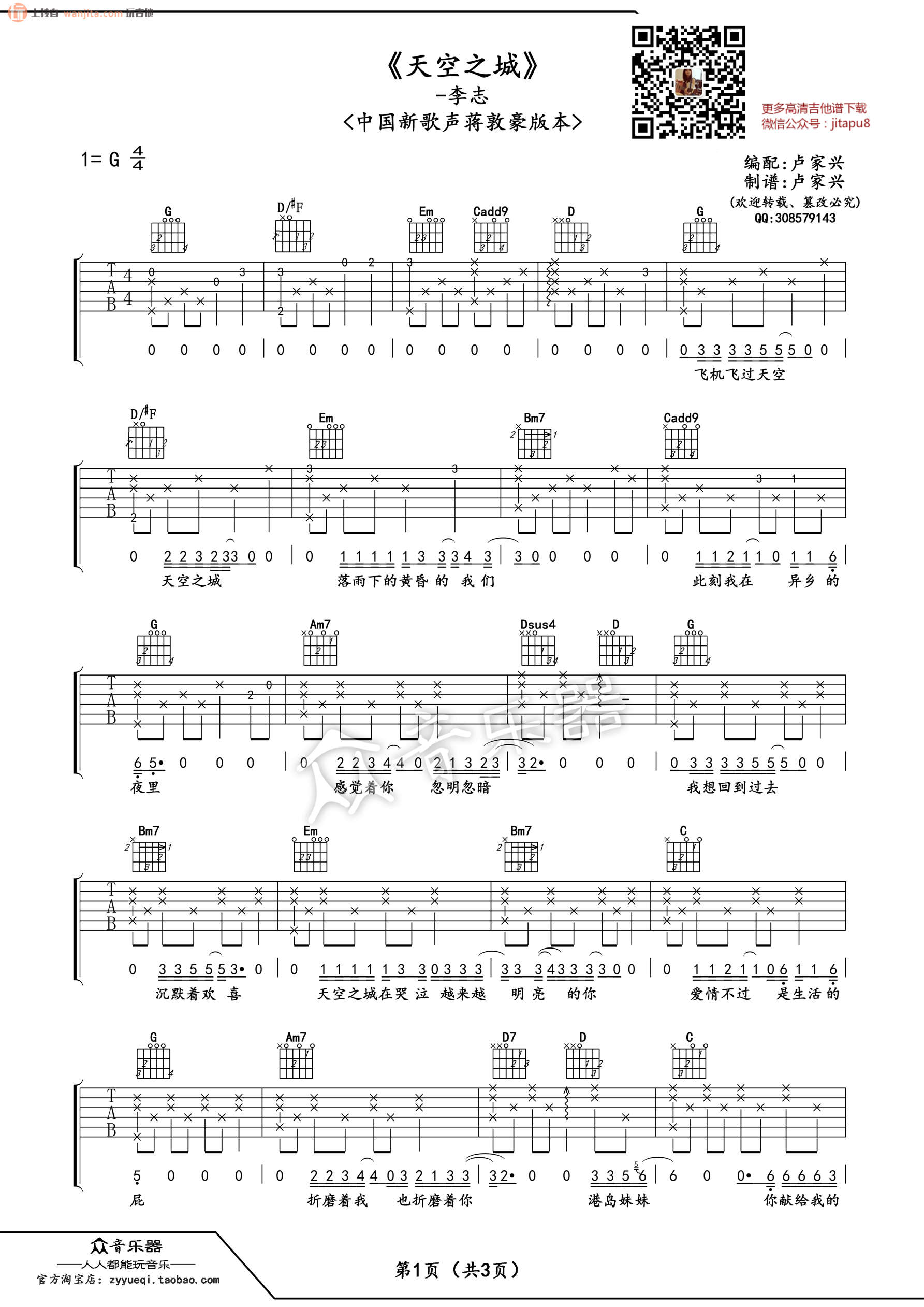 曲谱介绍: 《天空之城》吉他谱,由卢家兴制谱,总共3张高清图片谱,原调为G调,节拍4/4拍,不使用变调夹,弹唱难度初级。
