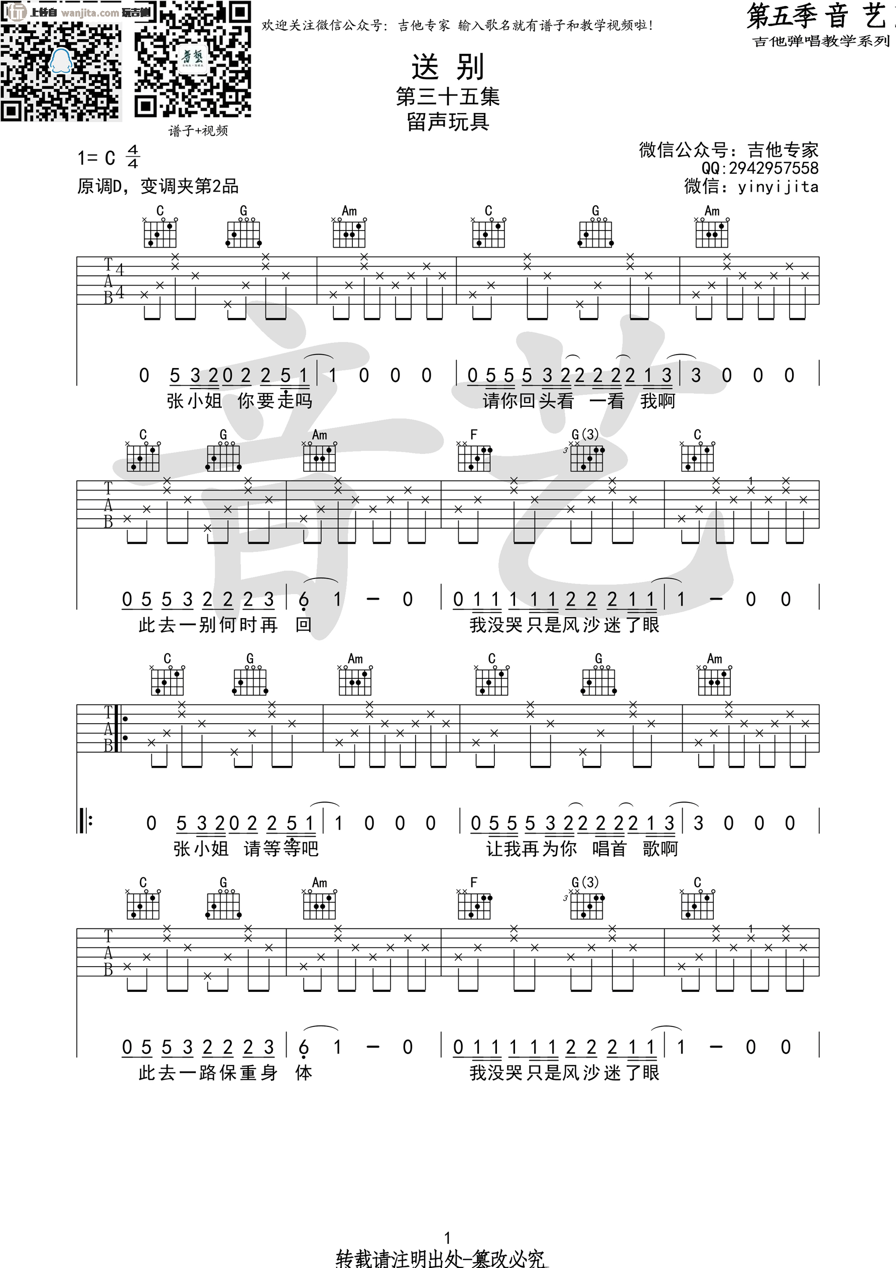 送别吉他谱 - 留声玩具 - C调吉他弹唱谱 - 原版
