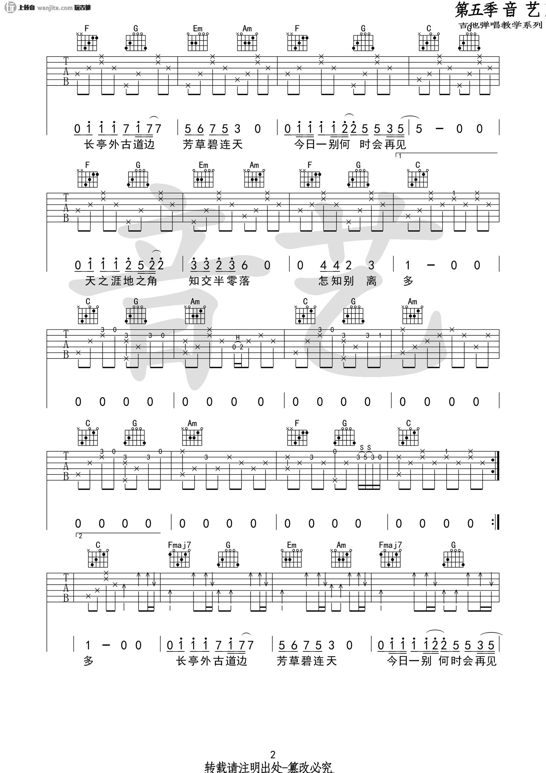 曲谱介绍: 《送别》吉他谱,由吉他专家制谱,总共3张高清图片谱,原调为D调,选用C调指法,节拍4/4拍,建议使用变调夹夹2品,弹唱难度初级。