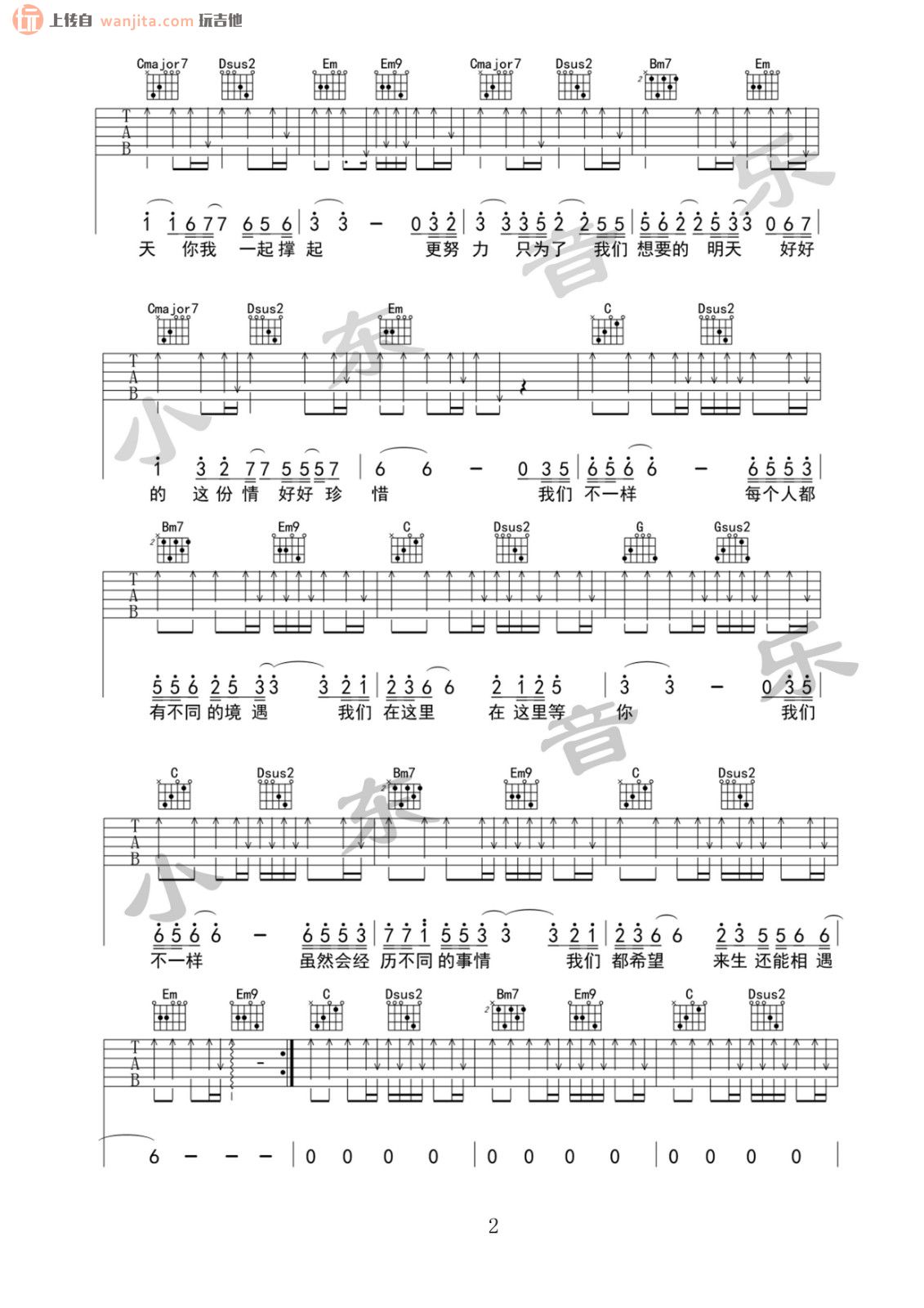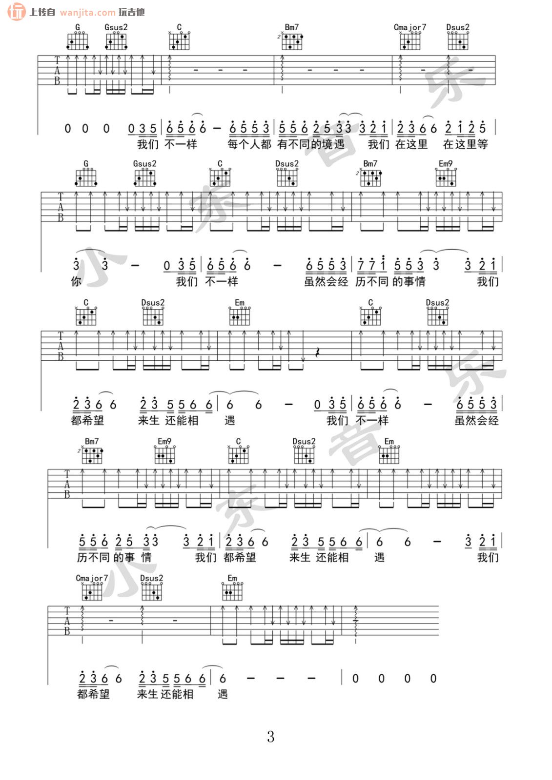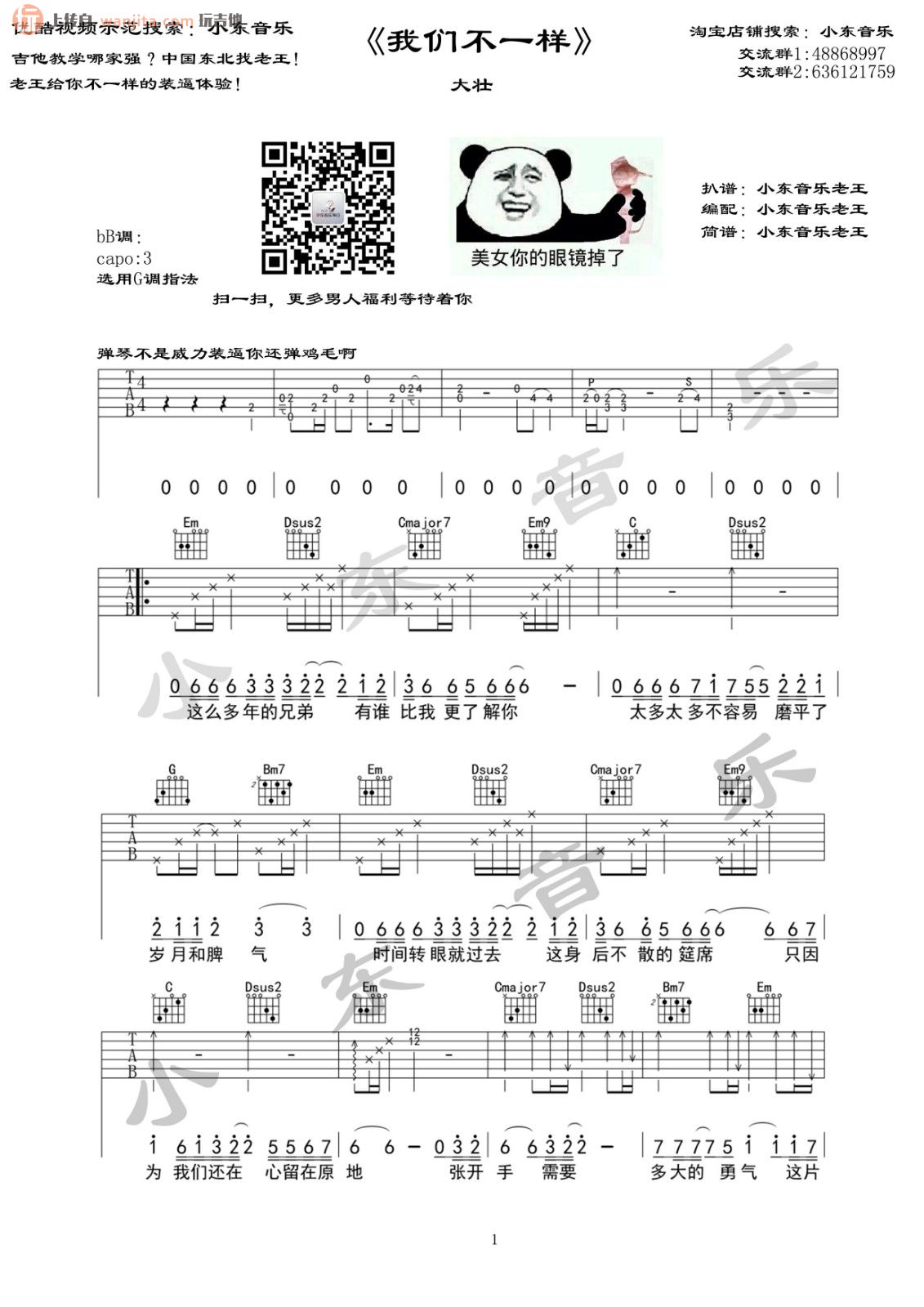 曲谱介绍: 大壮《我们不一样》吉他弹唱谱,共有3张高清图谱。