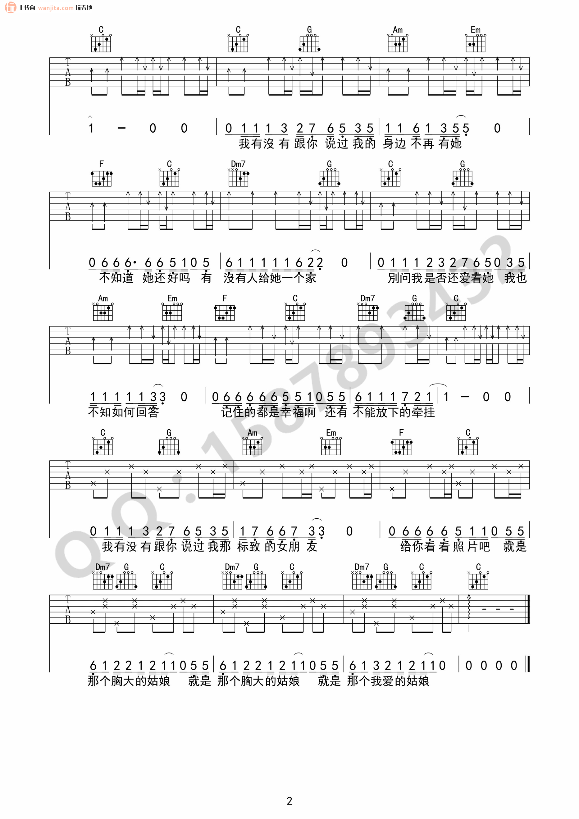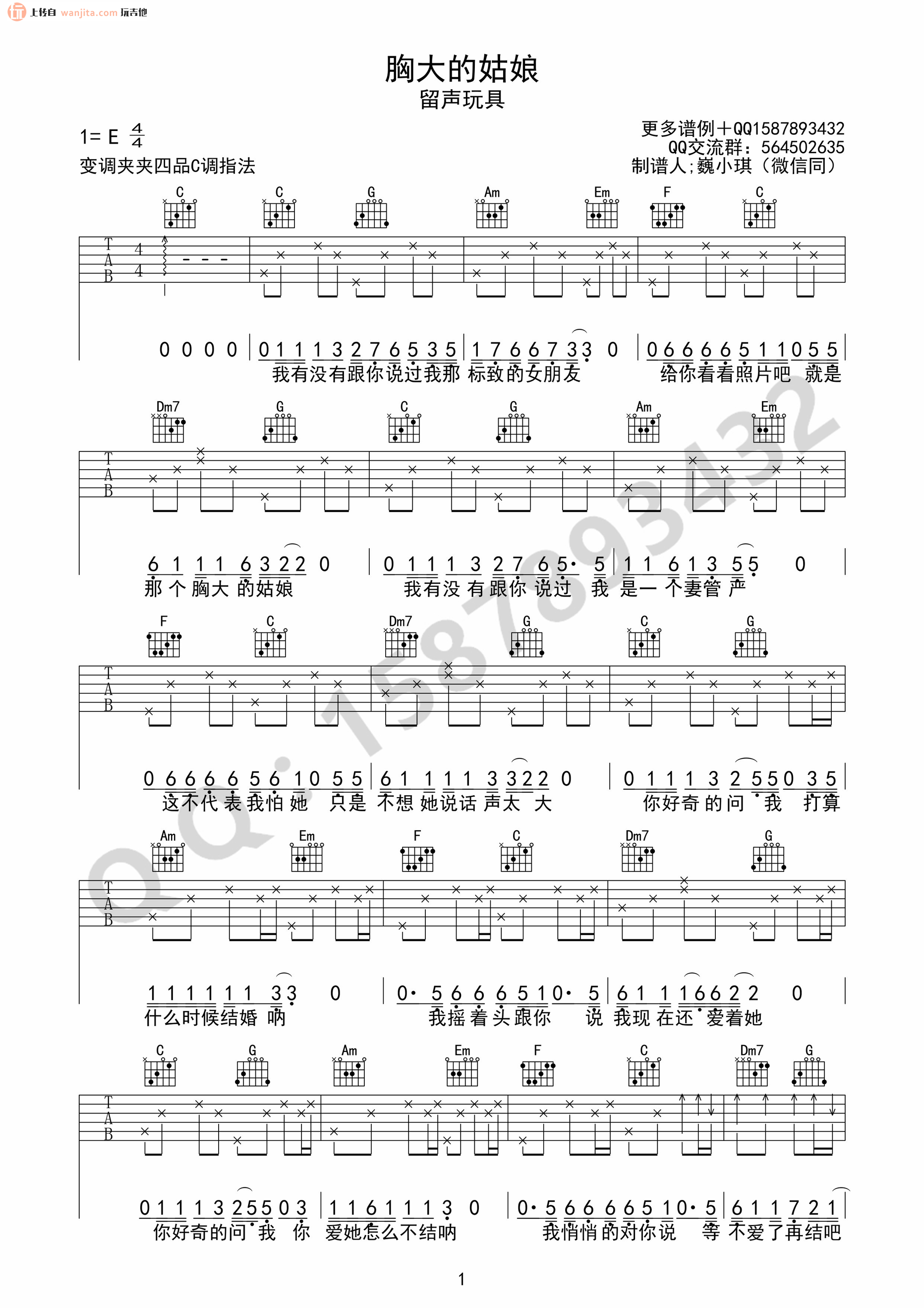 曲谱介绍: 《胸大的姑娘》吉他谱,总共2张高清图片谱,原调为E调,用C调指法编配,节拍4/4拍,弹唱建议使用变调夹夹4品,弹唱难度初级。