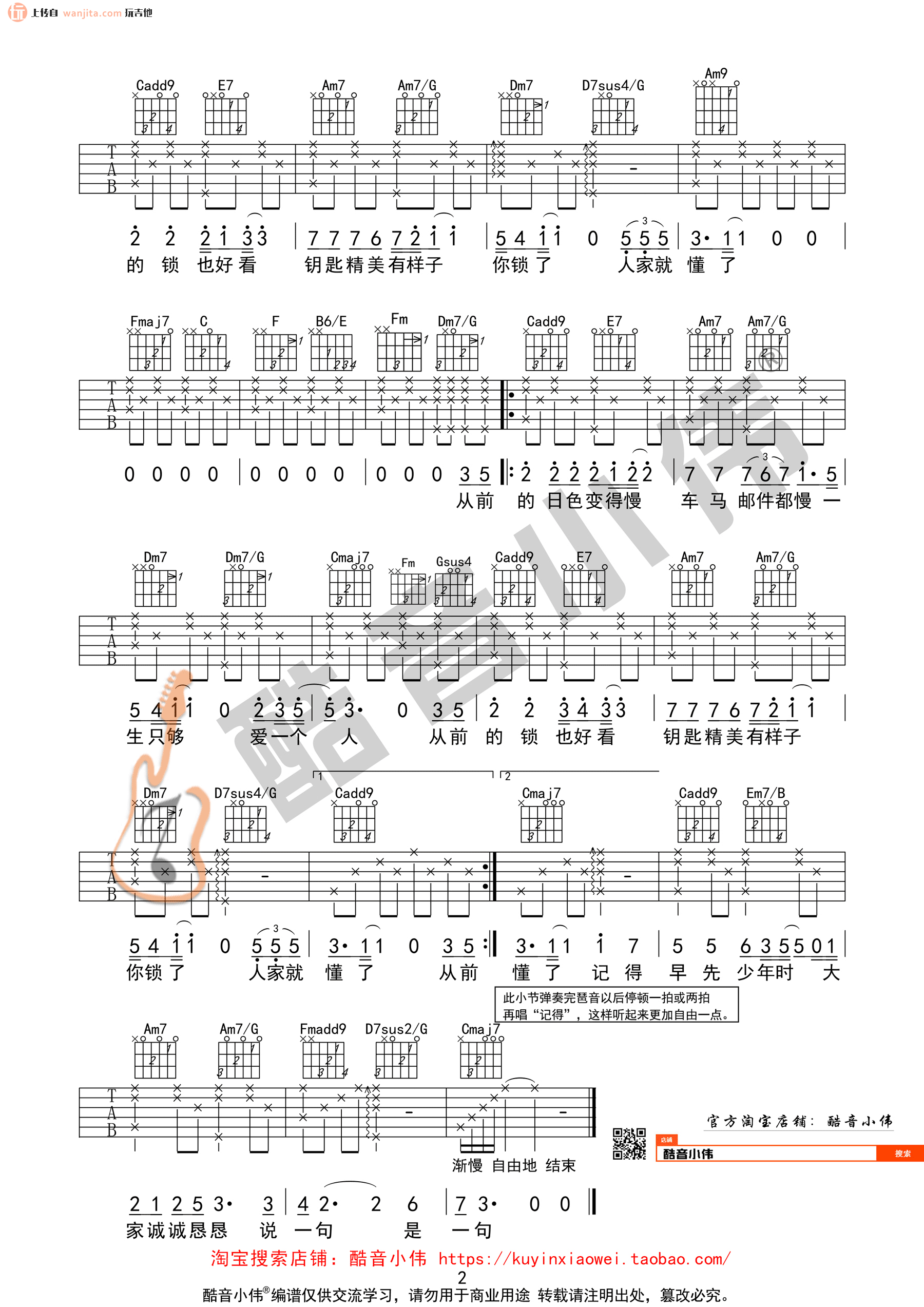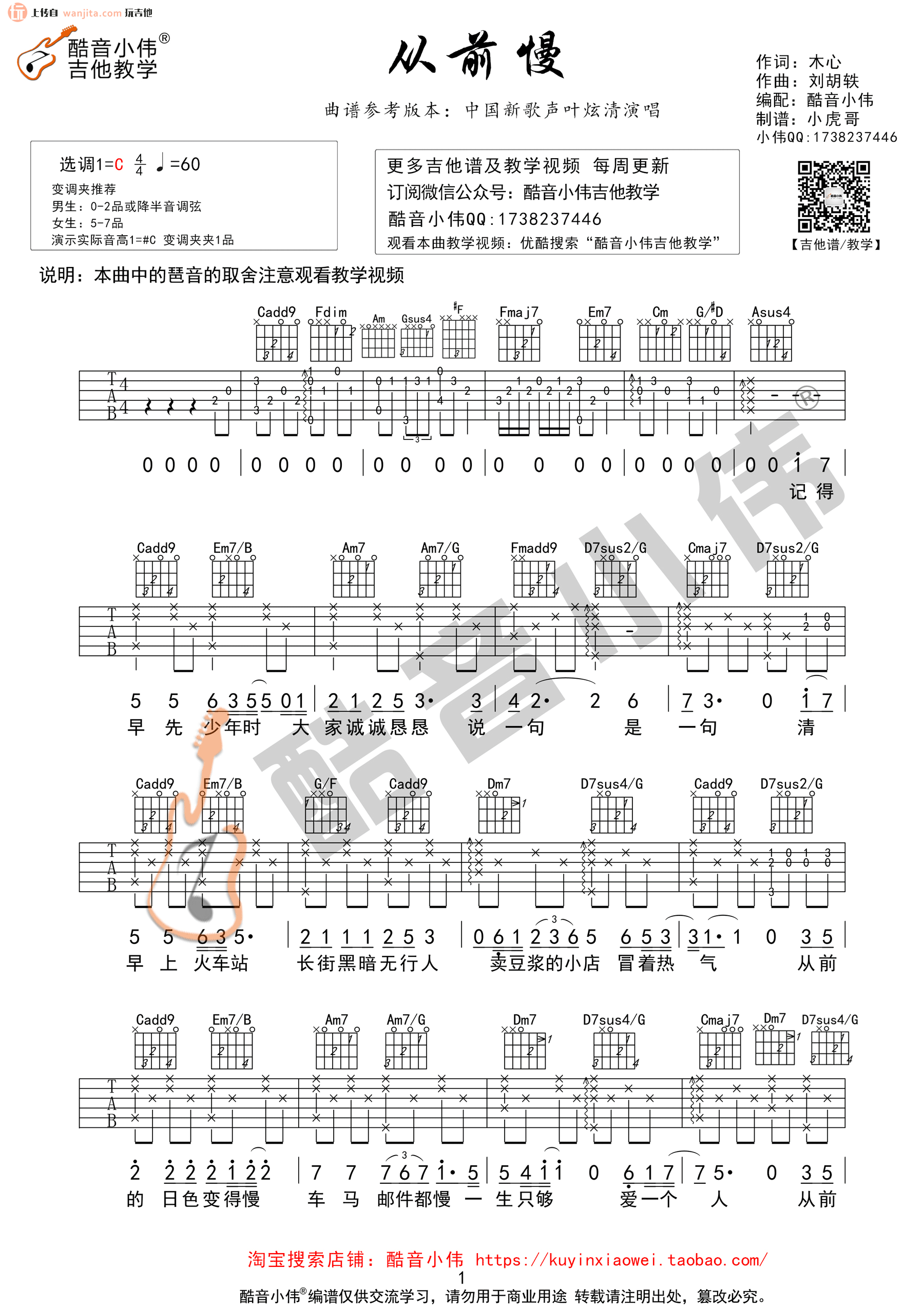 曲谱介绍: 《从前慢》吉他谱,总共2张高清图片谱,选用C调指法,节拍4/4拍,速度每分钟60BPM,男生弹唱使用变调夹夹0-2品或将半音调弦,女生弹唱使用变调夹夹5-7品,实际音高为升C调,变调夹夹1品,弹唱难度初级。