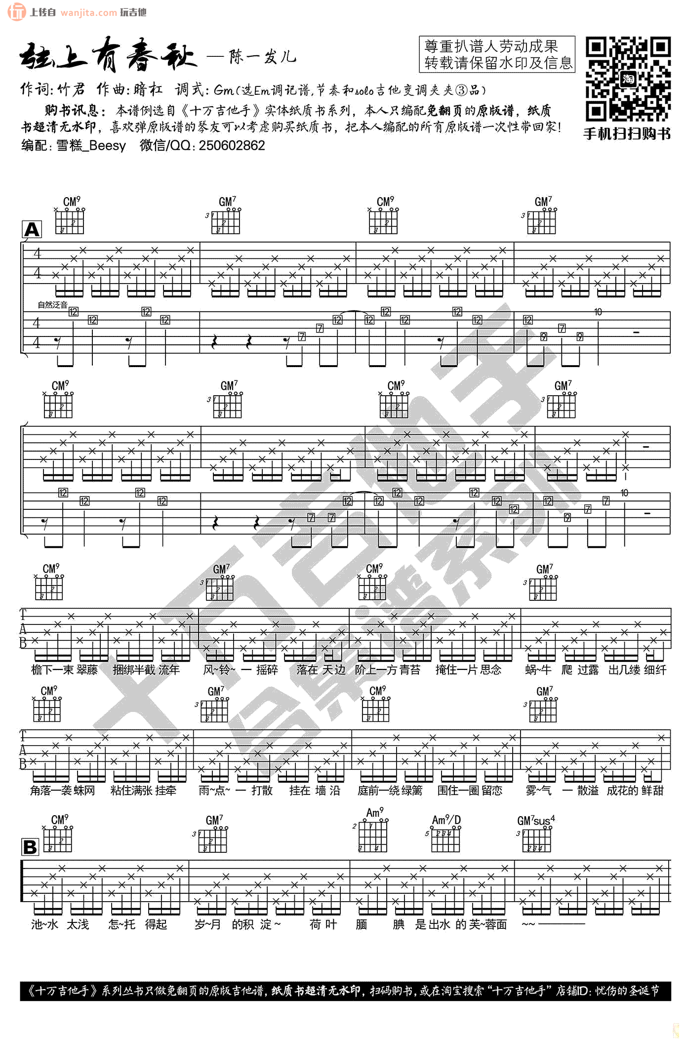曲谱介绍: 《弦上有春秋》吉他谱,总共2张高清图片谱,调式Gm调,选Em调记谱,弹唱使用变调夹夹3品,弹唱难度初级。