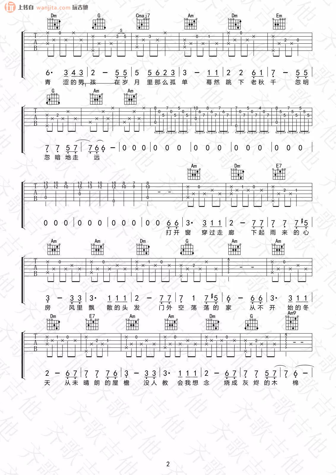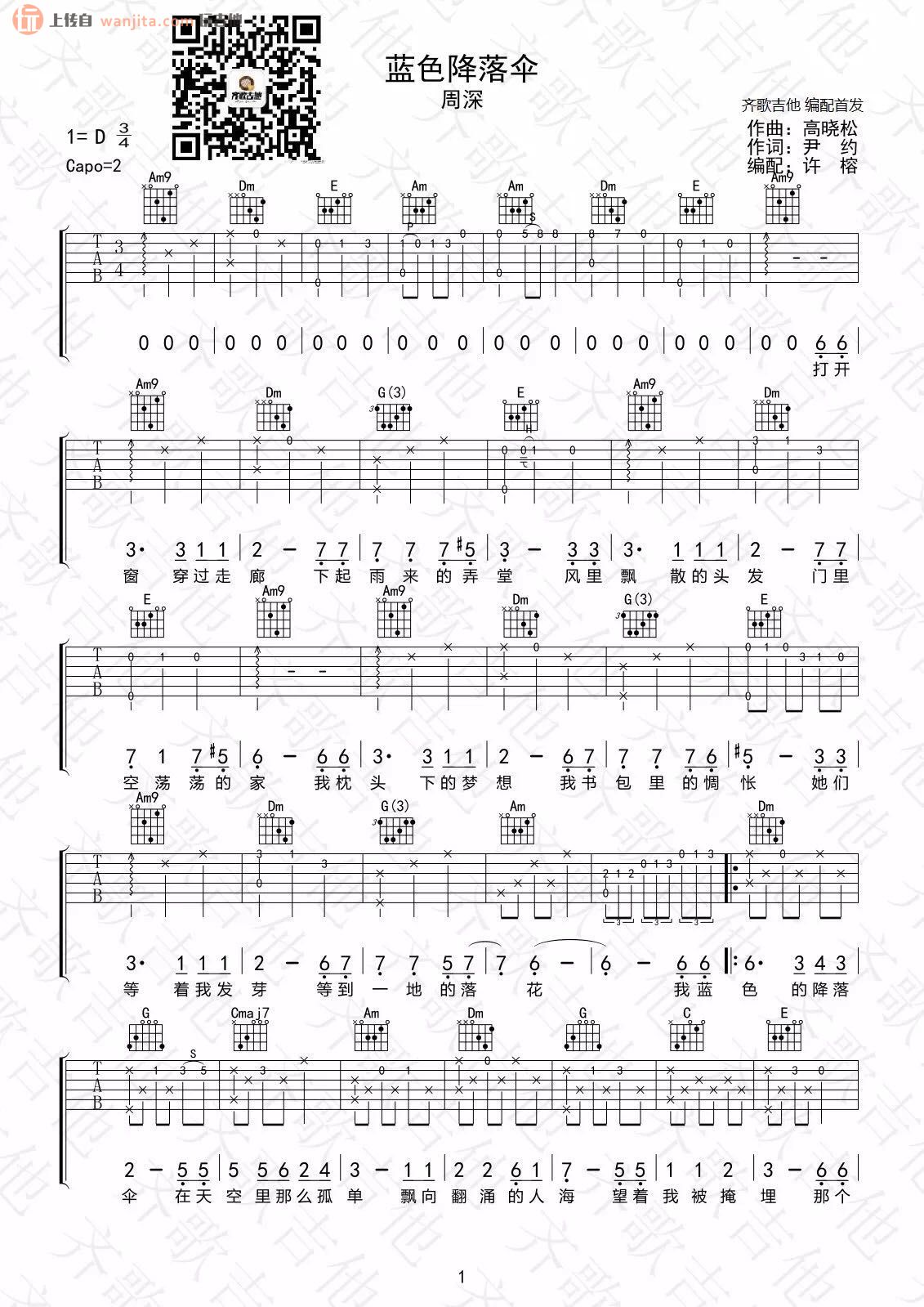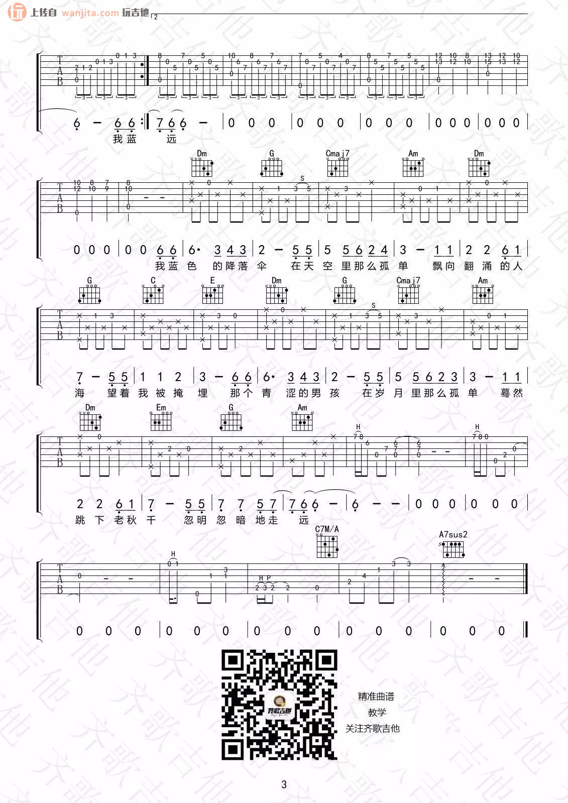 曲谱介绍: 《蓝色降落伞》吉他谱,总共3张高清图片谱,原调为D调,节拍3/4拍,建议使用变调夹夹2品,弹唱难度初级。