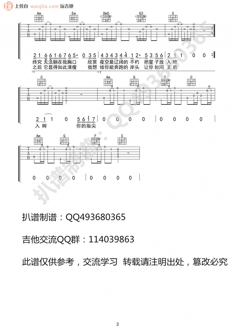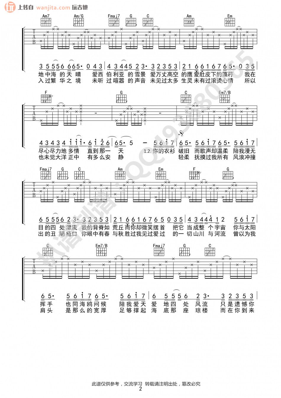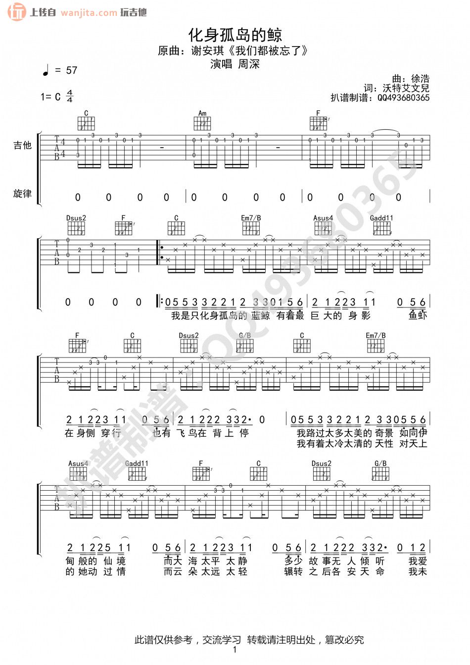 曲谱介绍: 《化身孤岛的鲸》吉他谱,总共3张高清图片谱,原调为C调,节拍4/4拍,速度每分钟57BPM,不使用变调夹,弹唱难度初级。