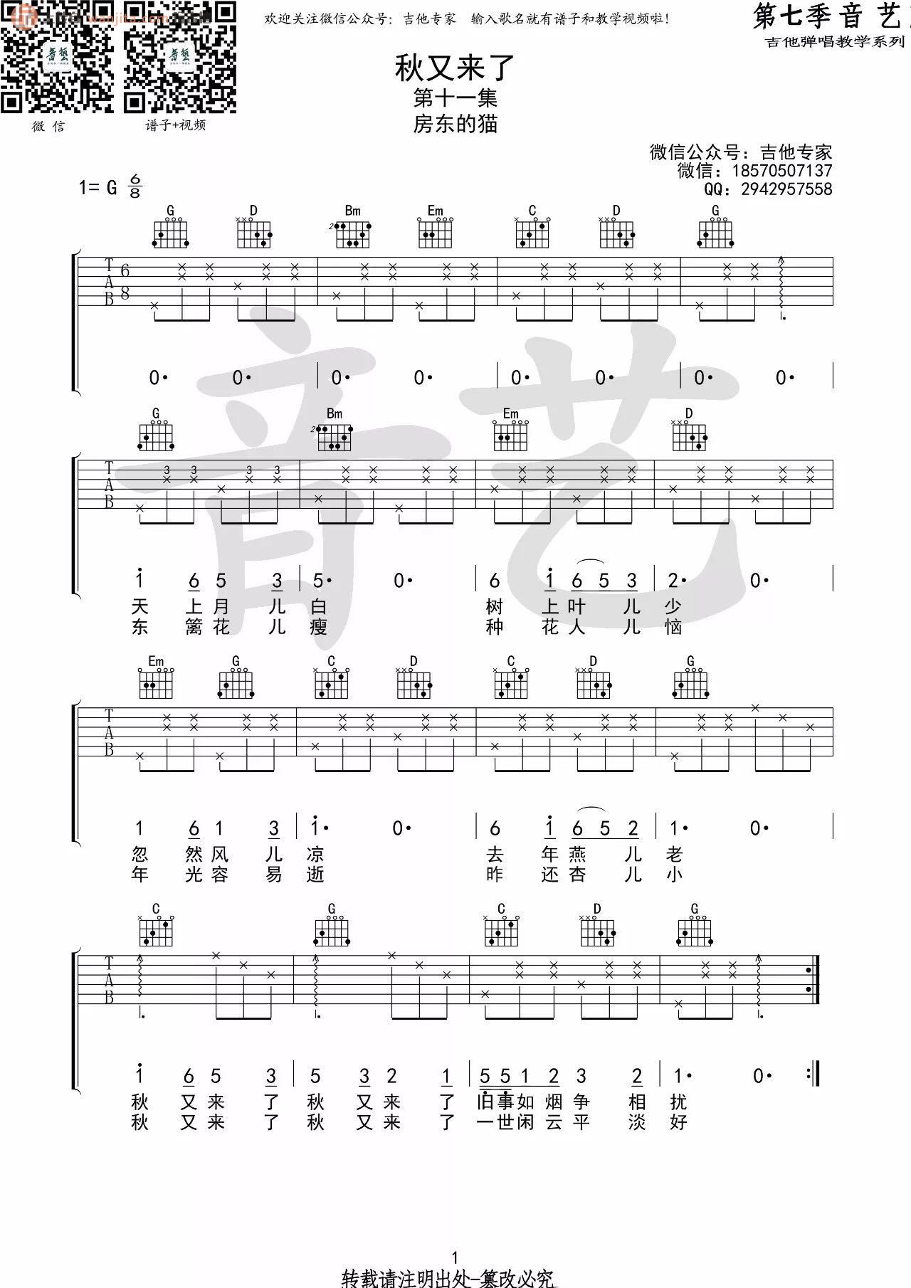 曲谱介绍: 《秋又来了》吉他谱,总共1张高清图片谱,原调为G调,节拍6/8拍,不使用变调夹,弹唱难度初级。