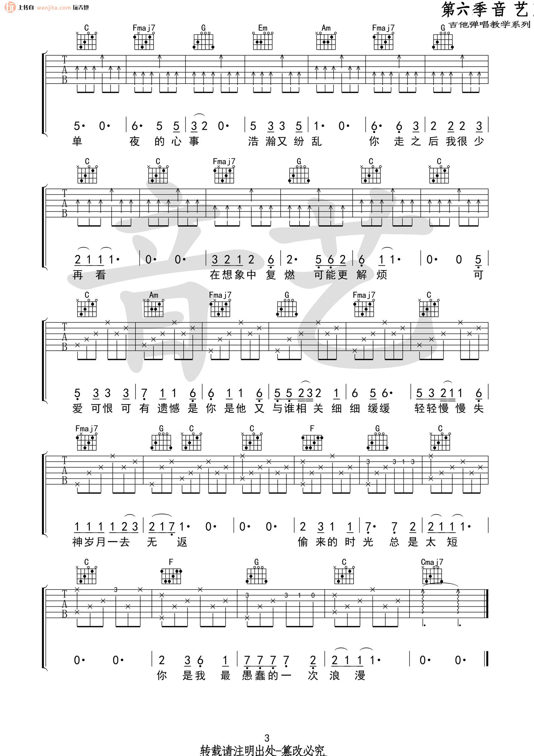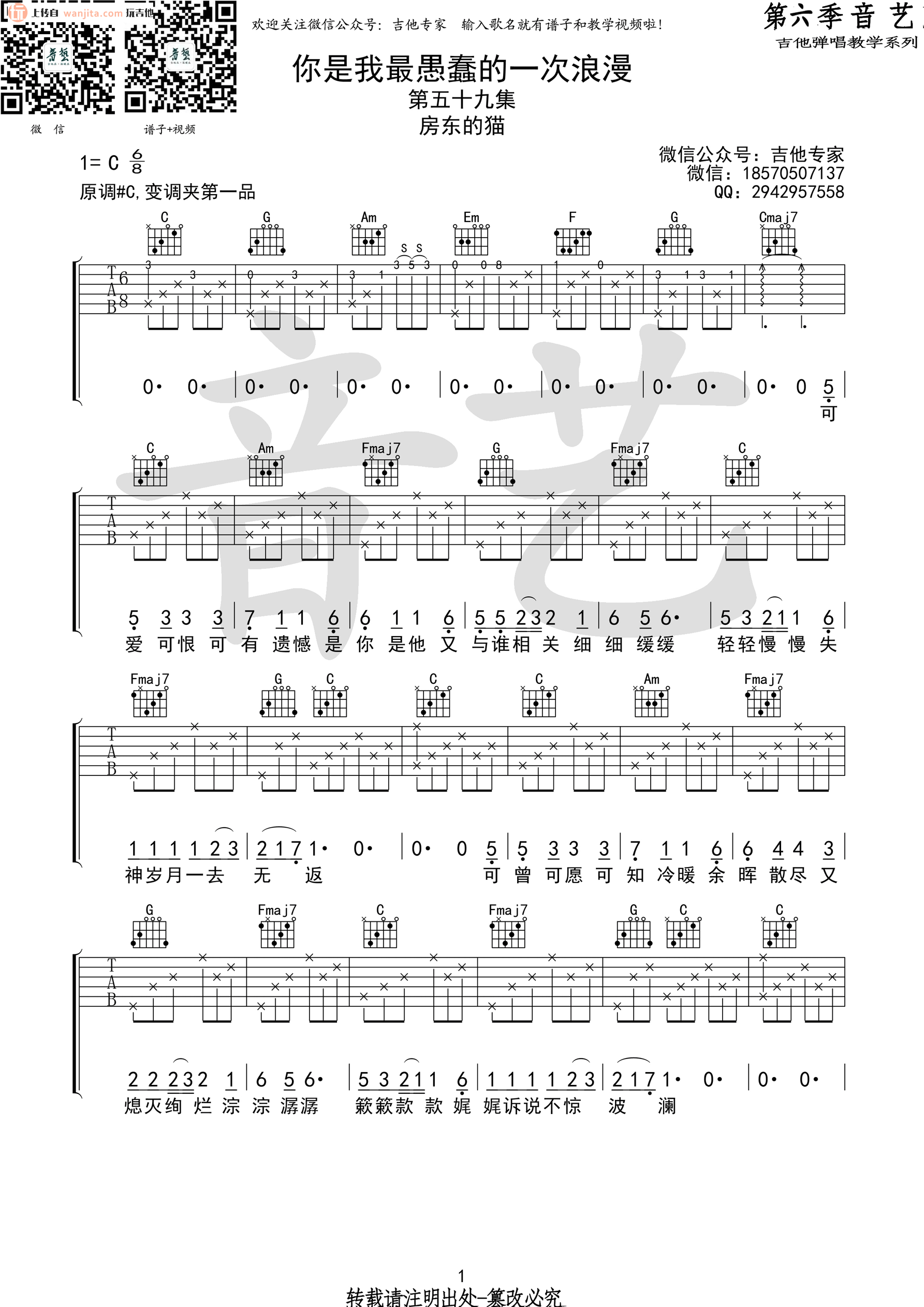 曲谱介绍: 《你是我最愚蠢的一次浪漫》吉他谱,总共3张高清图片谱,原调为升C调,选用为C调指法,节拍6/8拍,弹唱建议使用变调夹夹1品,弹唱难度初级。