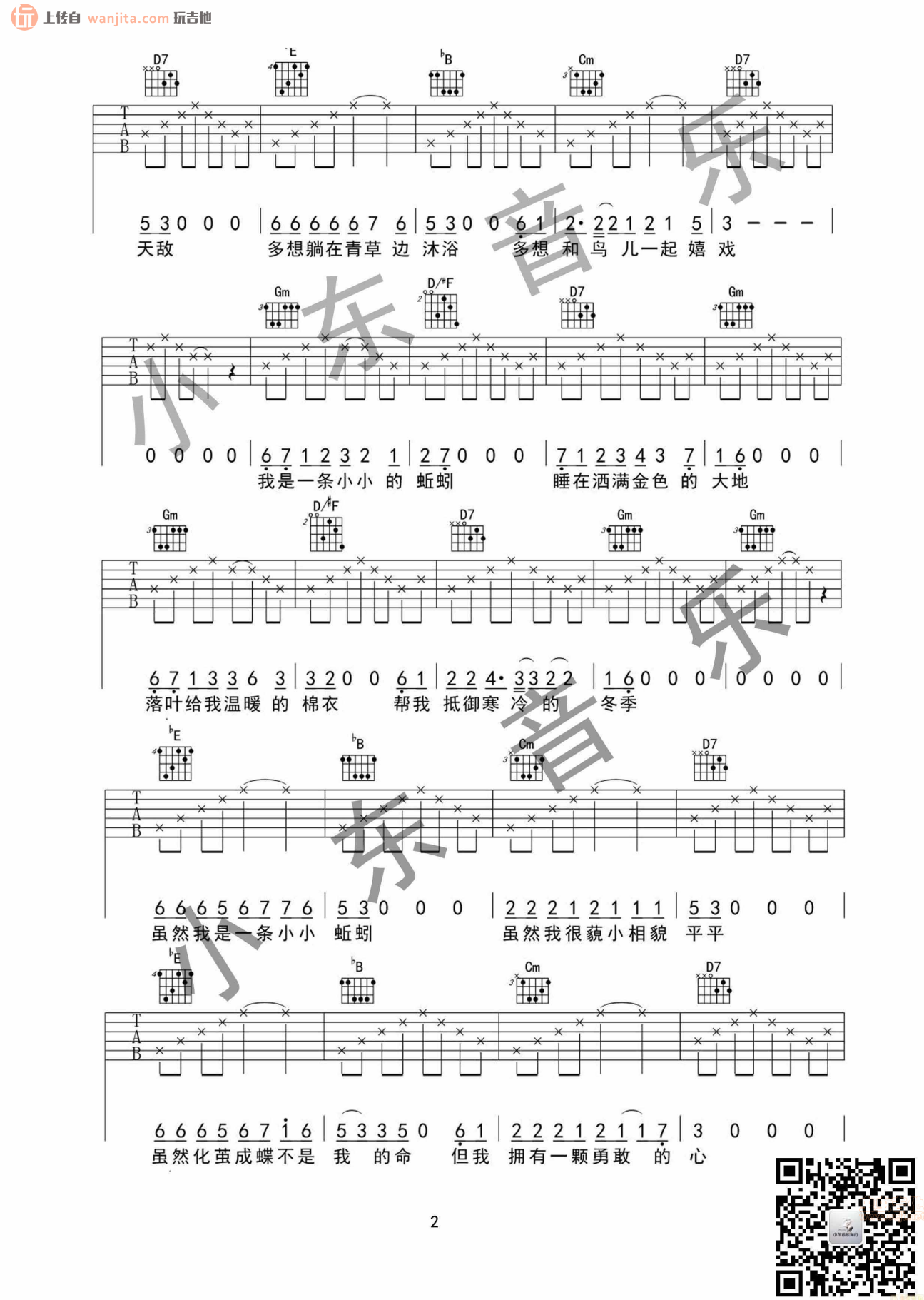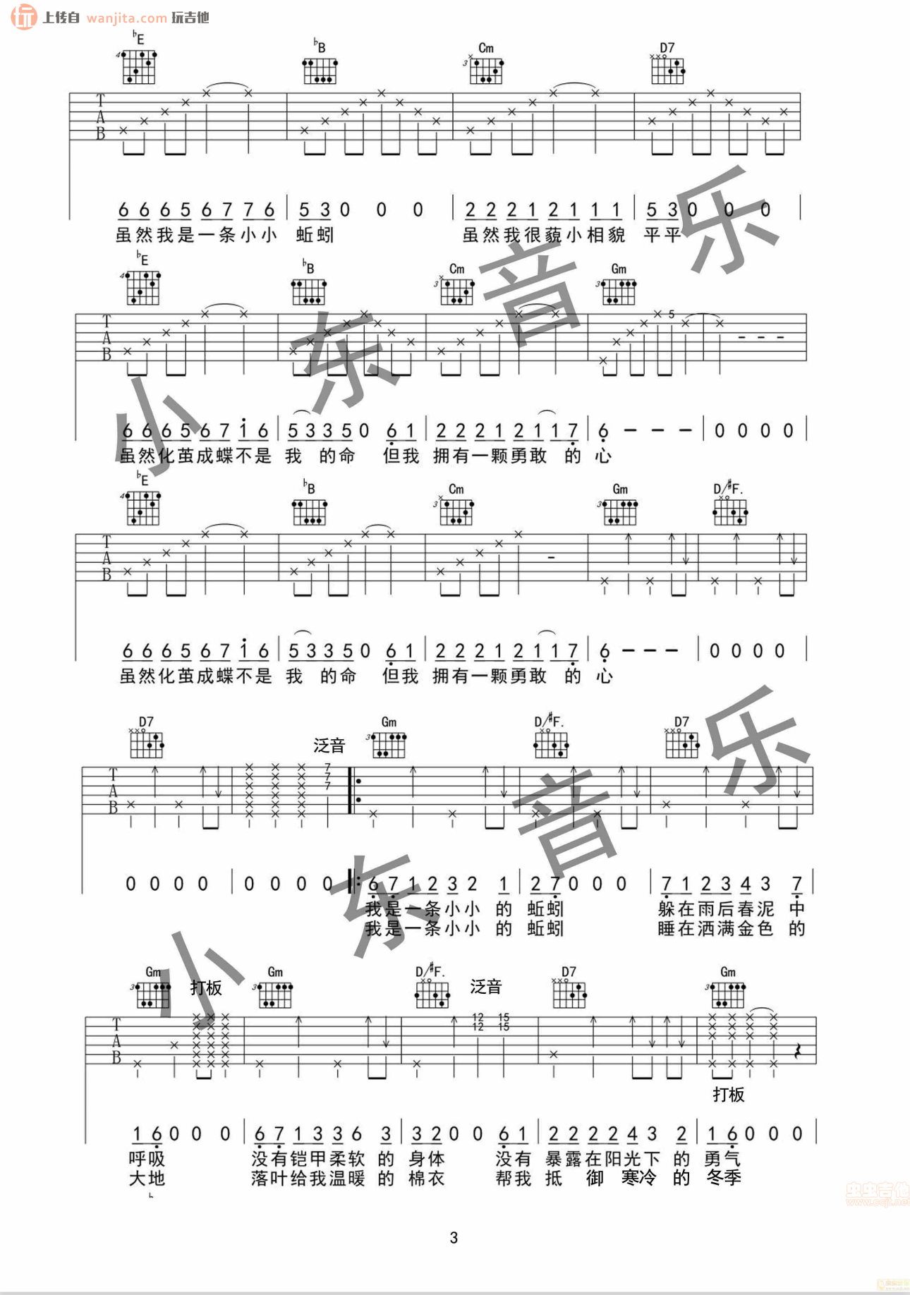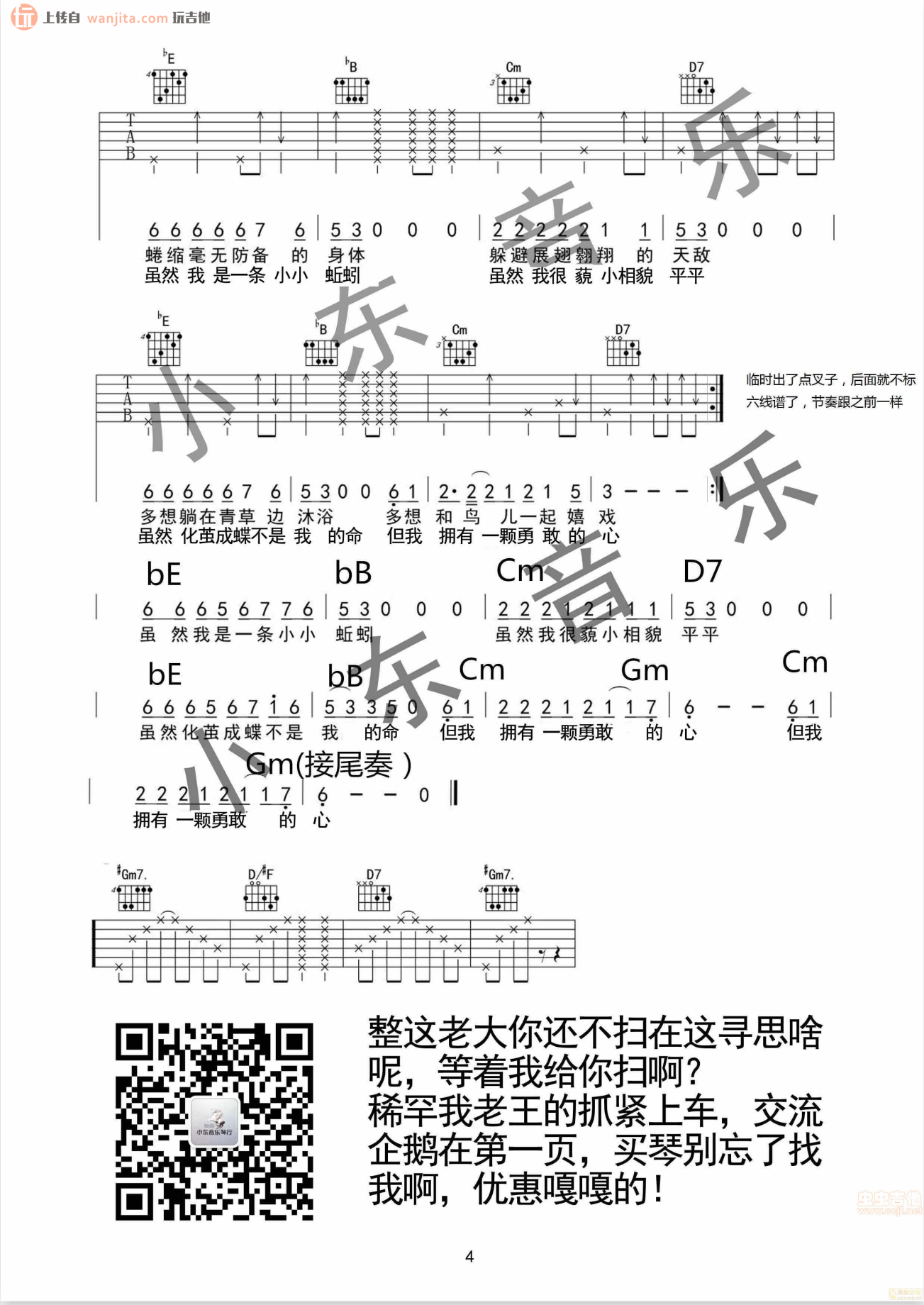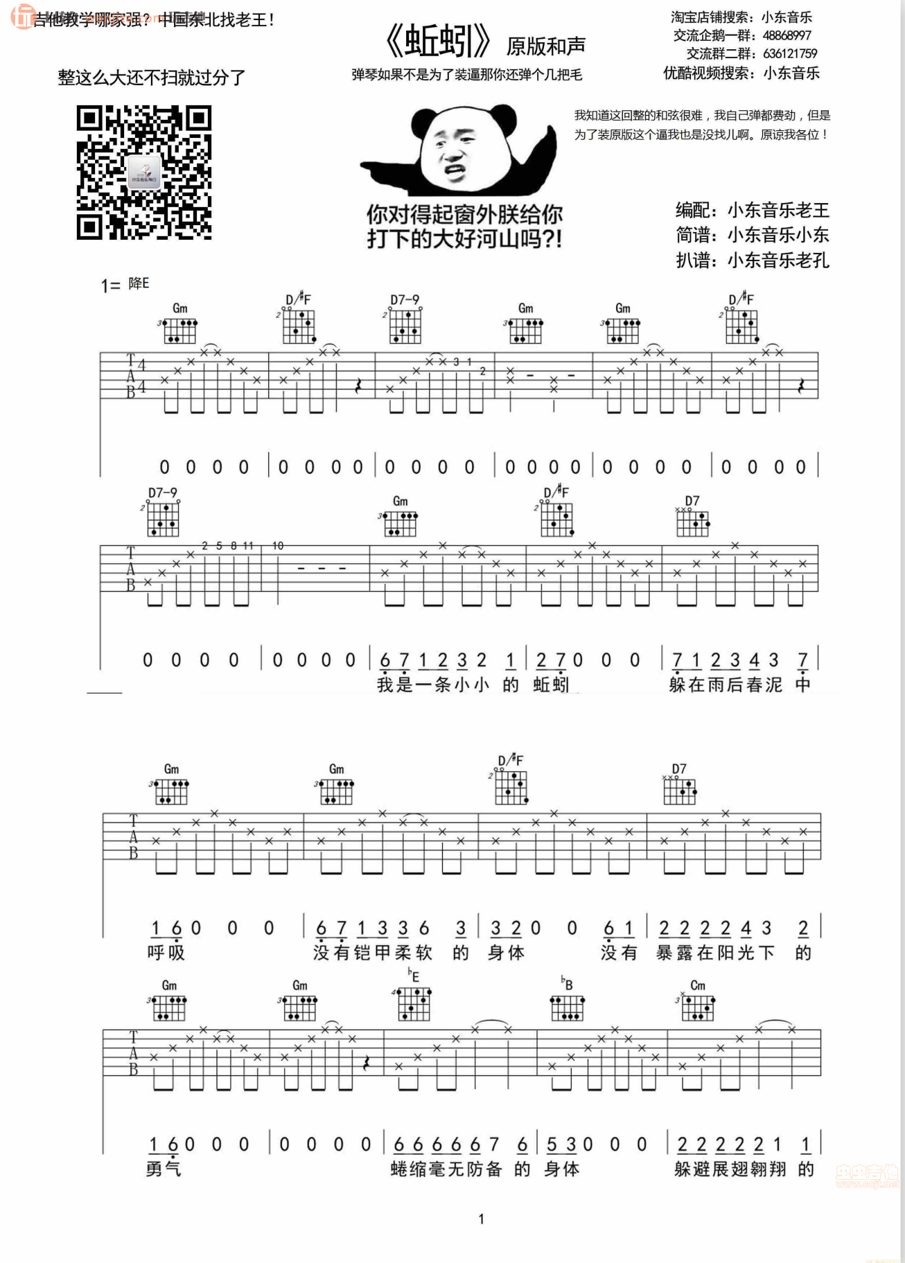 曲谱介绍: 杨紫《蚯蚓》吉他谱,由小东音乐制谱,总共4张高清图片谱,选调为降E调,节拍4/4拍,不使用变调夹,弹唱难度初级。
