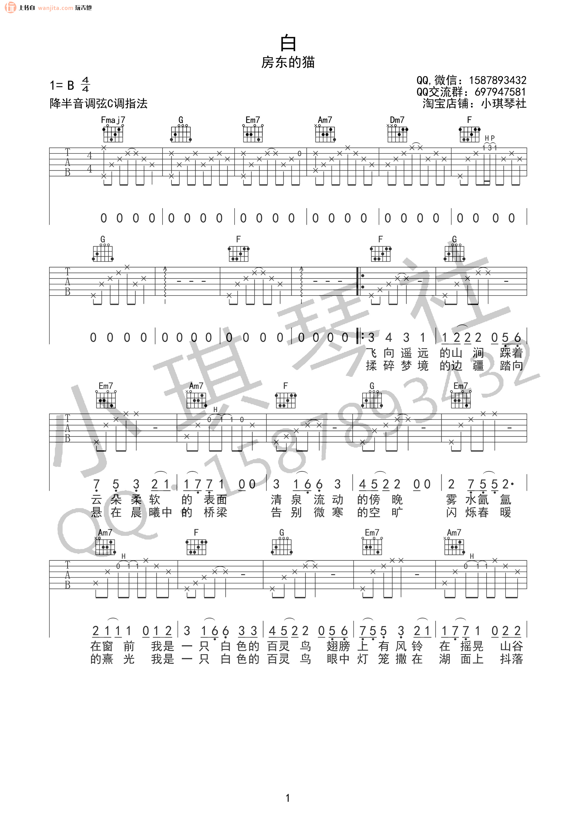 曲谱介绍: 房东的猫《白》吉他谱,总共2张高清图片谱,原调为B调,降半音调弦选调为C调指法,节拍4/4拍,不使用变调夹,弹唱难度初级。