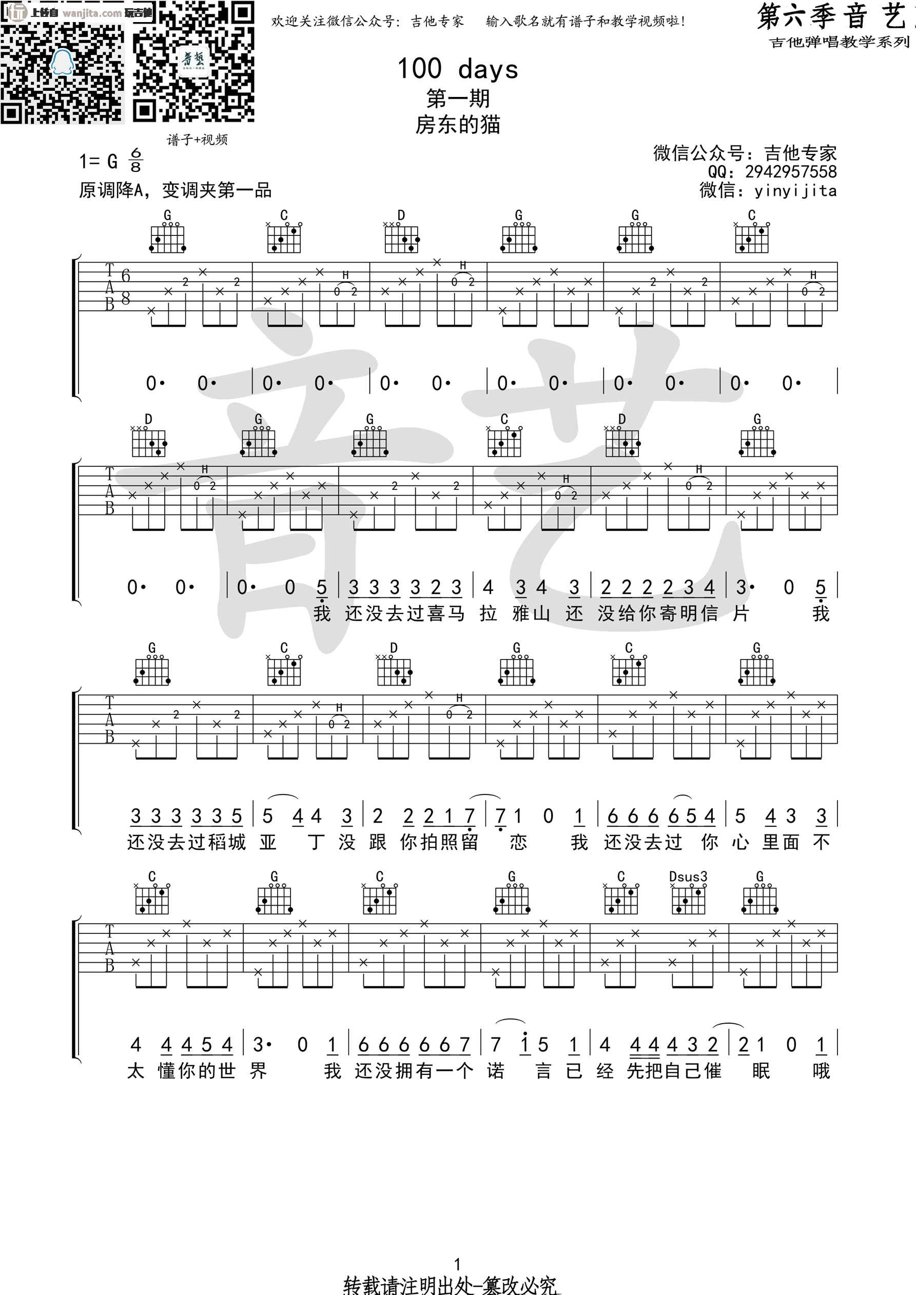 曲谱介绍: 《100 days》吉他谱,总共3张高清图片谱,原调为降A调,选调为G调,节拍6/8拍,弹唱建议使用变调夹夹1品,弹唱难度初级。