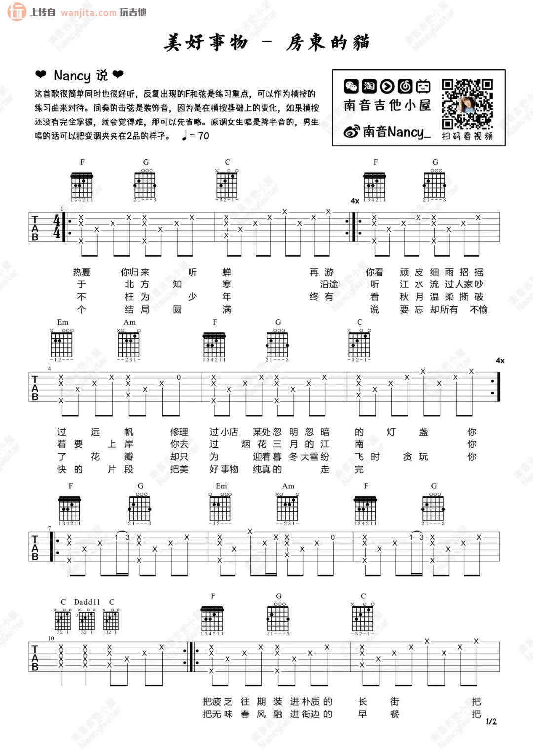 曲谱介绍: 房东的猫《美好事物》吉他弹唱谱,共有2张高清图谱,免翻页排版设计。