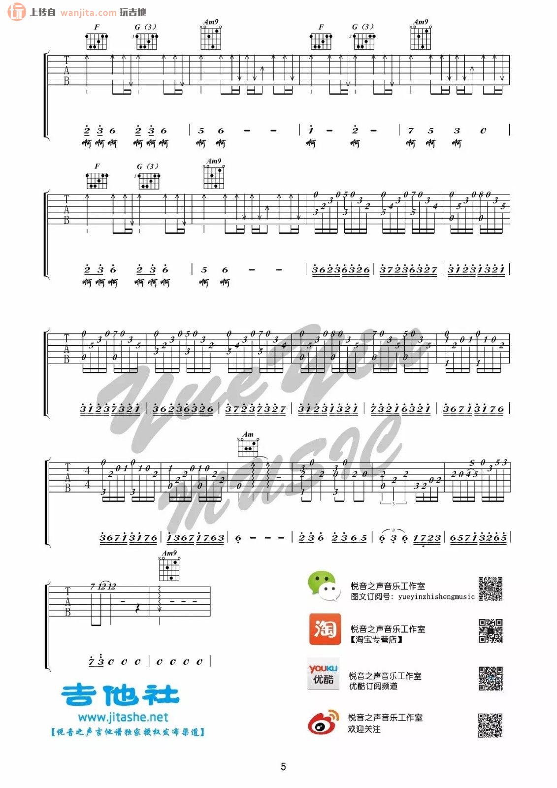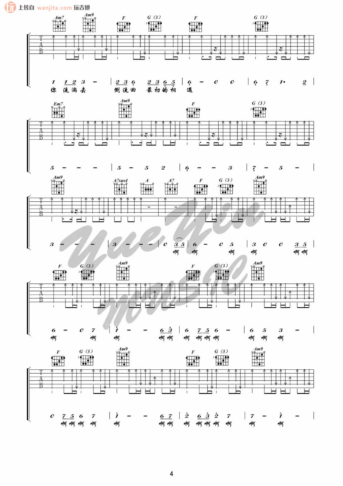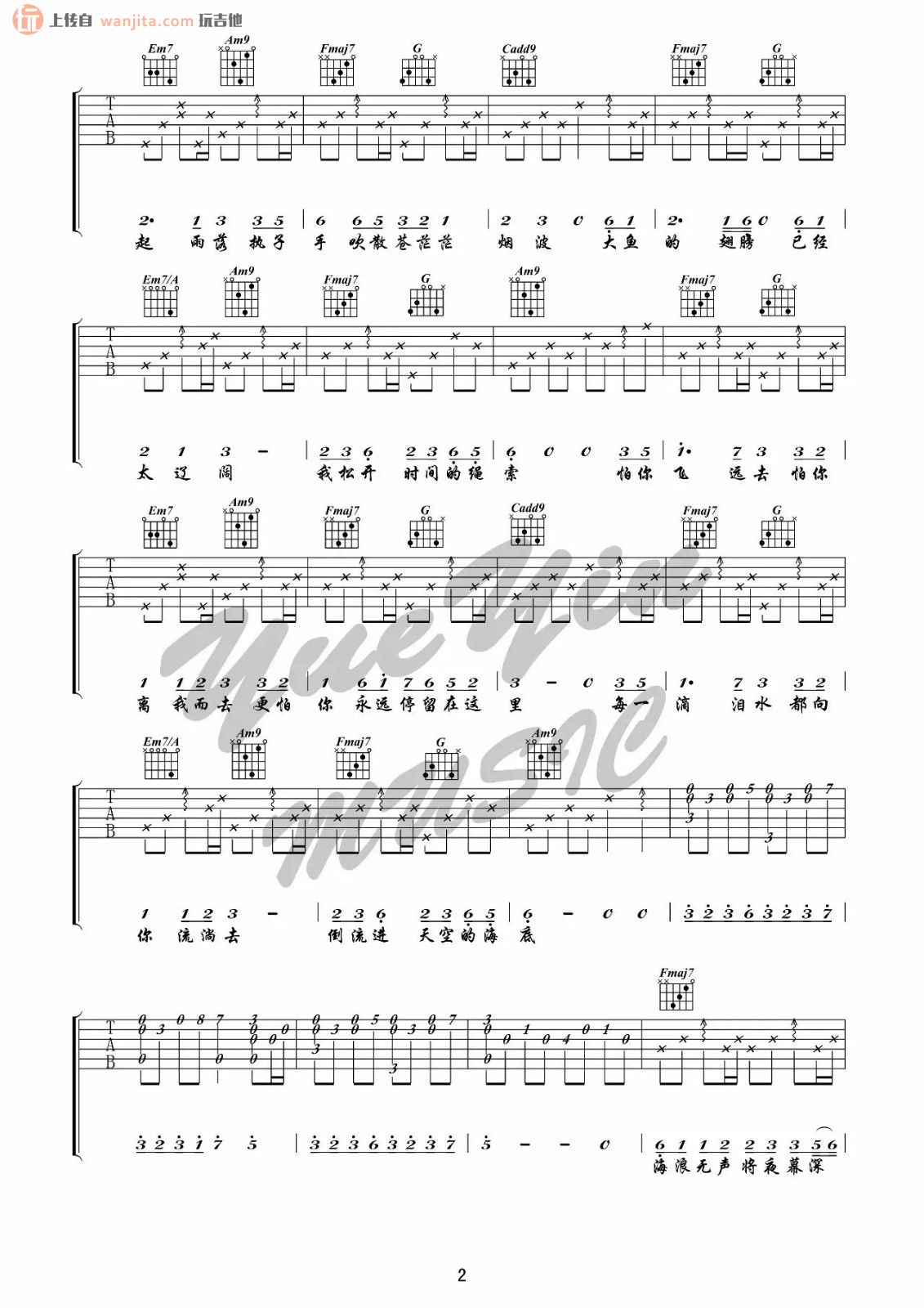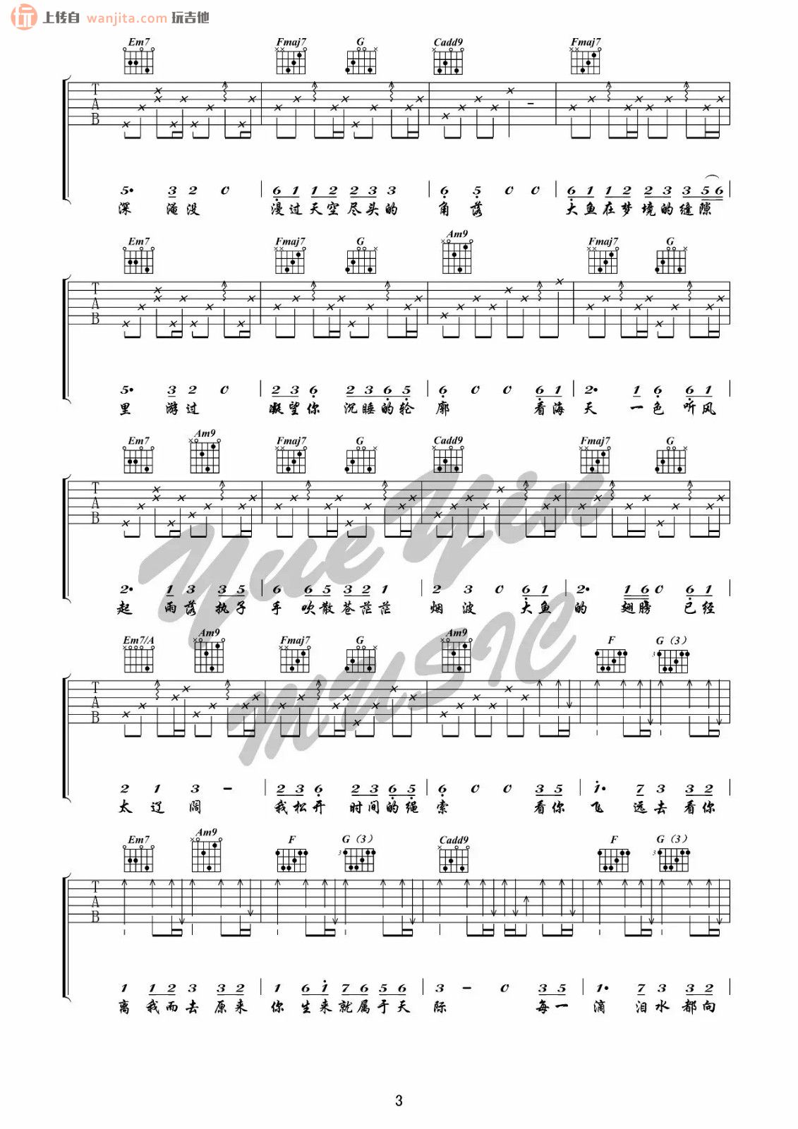 曲谱介绍: 《大鱼》吉他谱,由悦音之声制谱,总共5张高清图片谱,原调为降D调,节拍4/4拍,弹唱建议变调夹夹1品,弹唱难度初级。 周深《大鱼》吉他弹唱教学视频