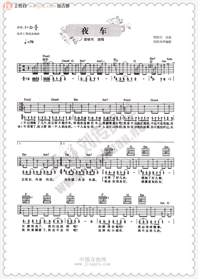 曲谱介绍: 《夜车》吉他谱,总共2张高清图片谱,原调为D调,选用C调指法编配,节拍4/4拍,速度每分钟70BPM,不使用变调夹,弹唱难度初级。