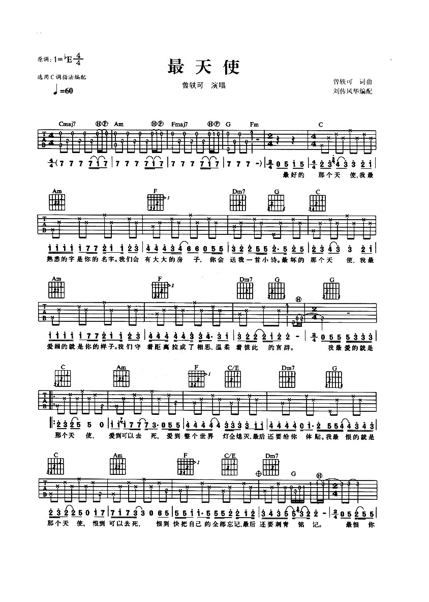 曲谱介绍: 最天使吉他谱,总共2张高清图片谱,原调是bE调,4/4拍,这个版本选用的C调指法编配,由刘传风华艺校提供曲谱。