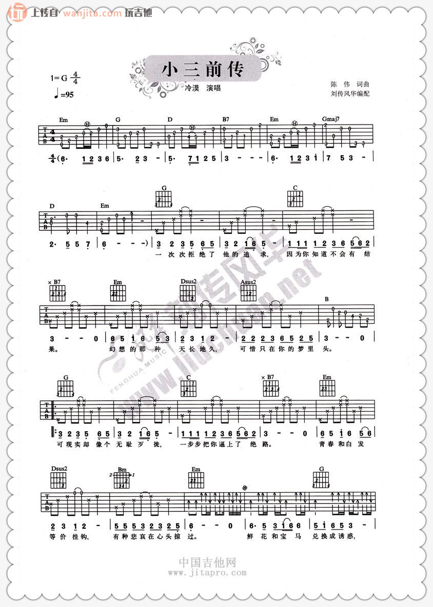 曲谱介绍: 《小三前传》吉他谱,总共2张高清图片谱,原调为G调,节拍4/4拍,速度每分钟95BPM,不使用变调夹,弹唱难度初级。