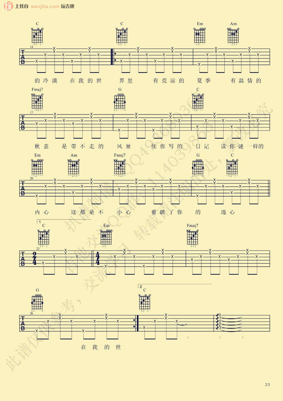 曲谱介绍: 《带不走的风景》吉他谱,总共2张高清图片谱,速度每分钟66BPM,弹唱建议使用变调夹夹3品,弹唱难度初级。