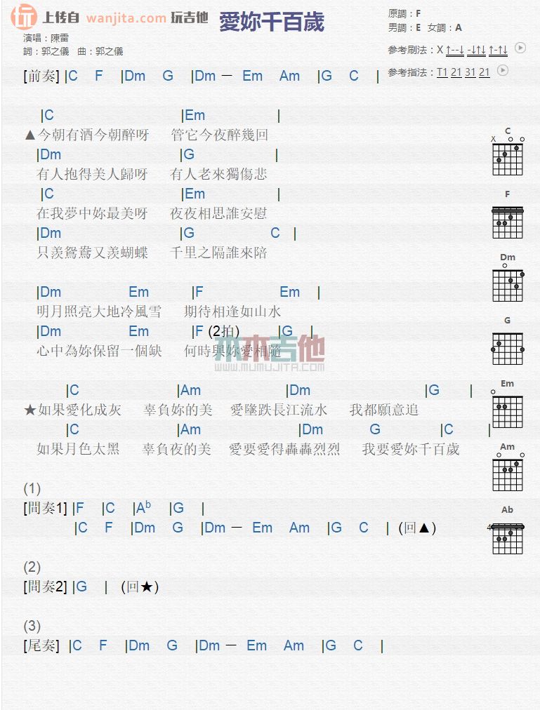 曲谱介绍: 《爱你千百岁》吉他谱,总共1张高清图片谱,原调为F调,男调为E调,女调为A调,不使用变调夹,弹唱难度初级。