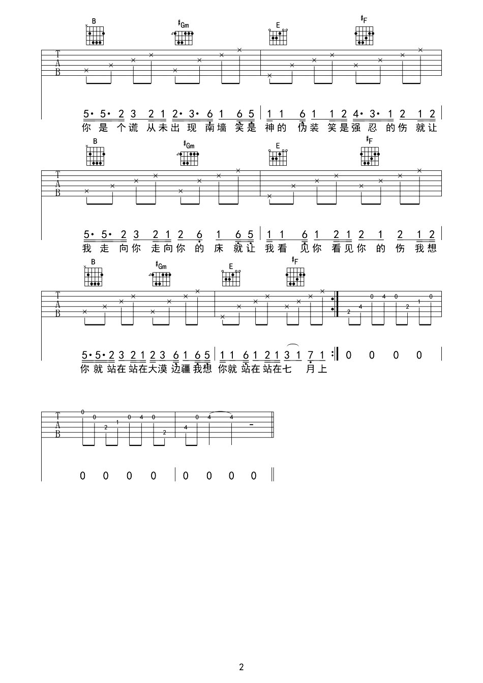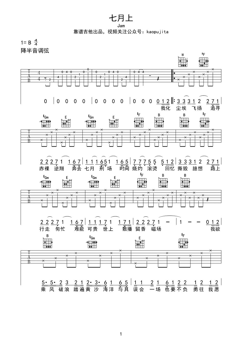 曲谱介绍: 《七月上》吉他谱,总共2张高清图片谱,原调为B调,降半音调弦,节拍4/4拍,弹唱建议使用变调夹夹一品,弹唱难度初级。