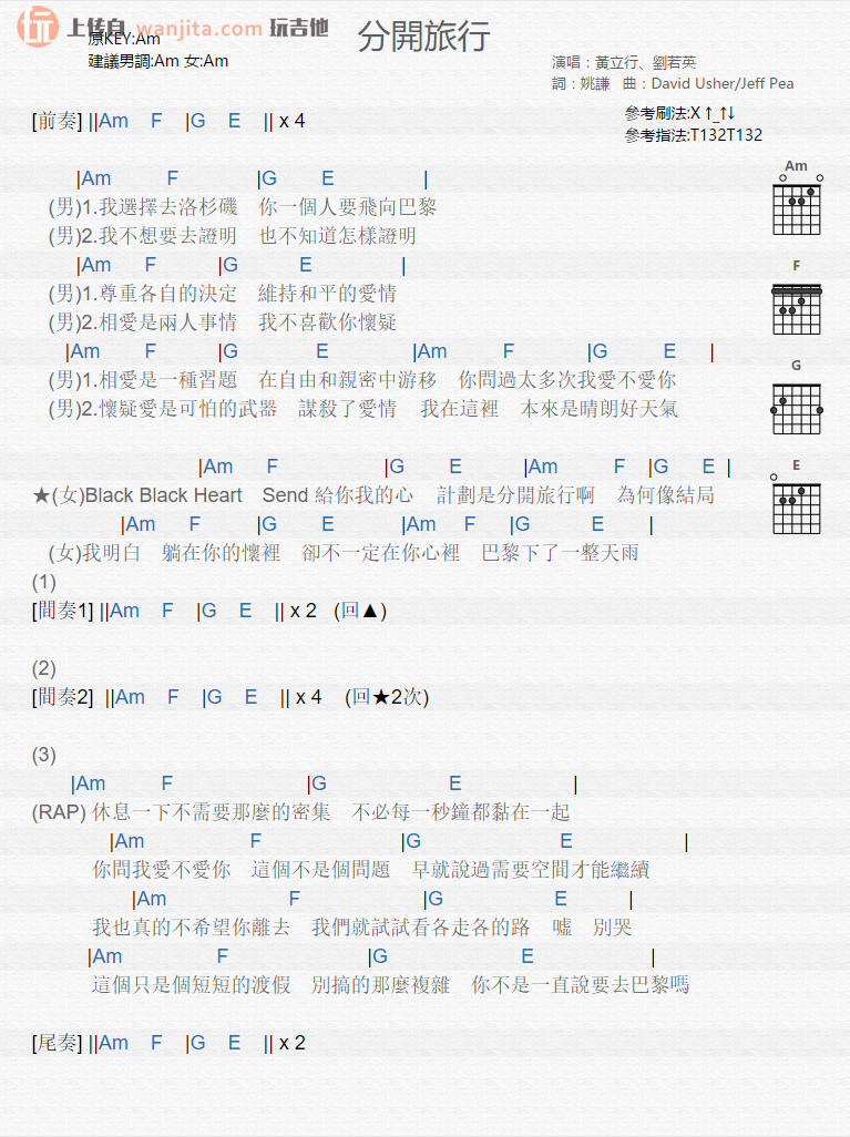 曲谱介绍: 《分开旅行》吉他谱,总共1张高清图片谱,原调为Am调,男调为Am调,女调为Am调,不使用变调夹,弹唱难度初级。