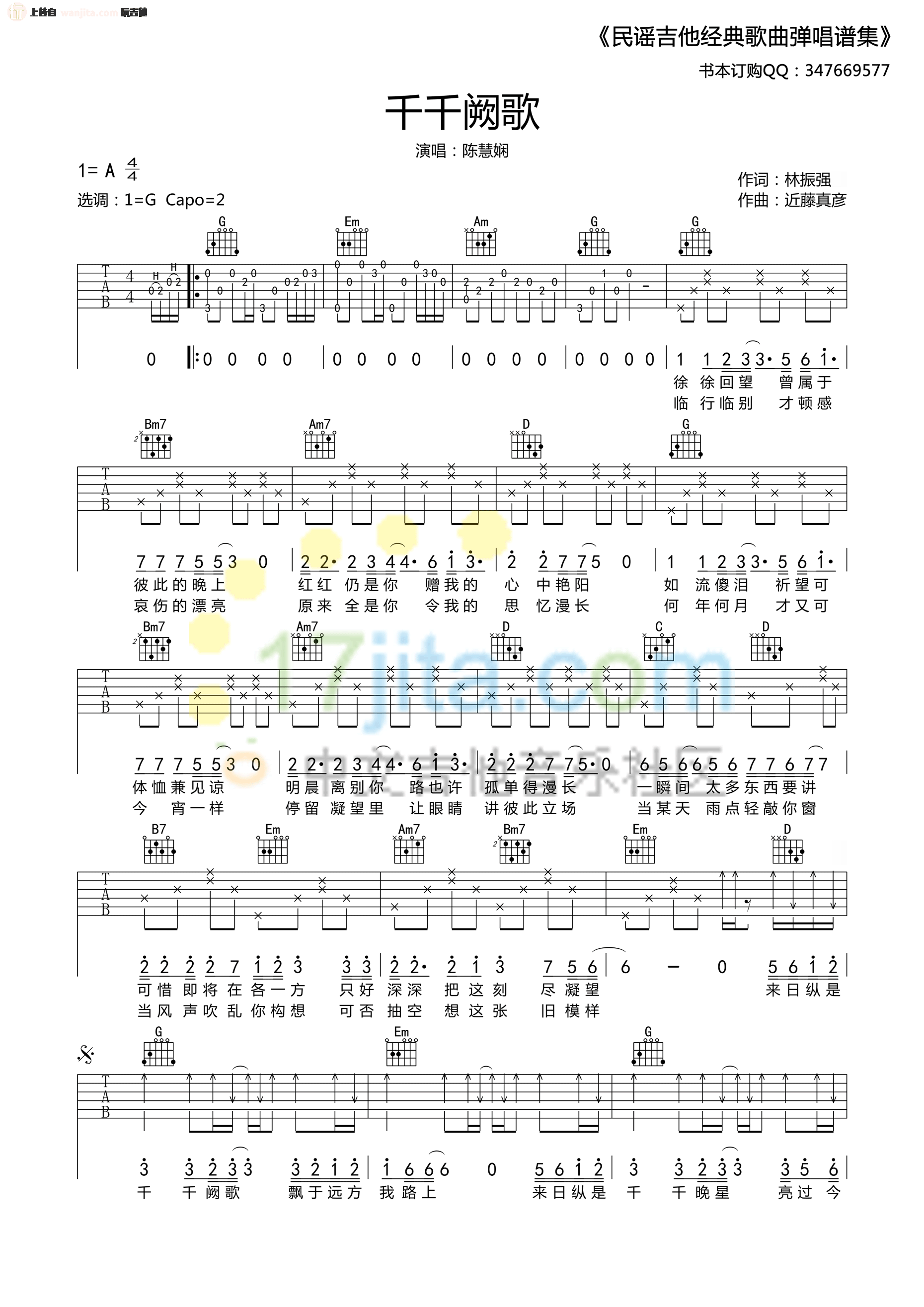 曲谱介绍: 千千阙歌吉他谱是一首经典的香港歌曲,由陈慧娴原唱,多次被不同的歌手翻唱。本首曲谱来自17吉他编配,玩吉他整理上传,选用G调,喜欢的朋友可以登录后收藏哦