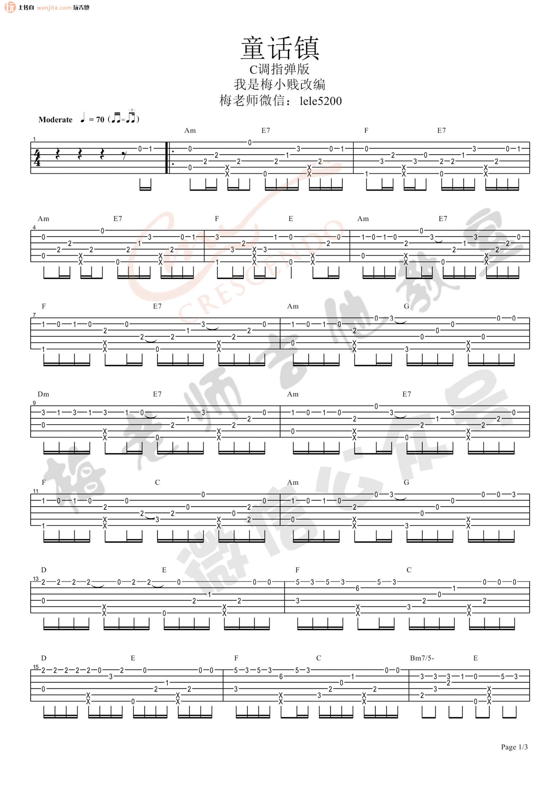 曲谱介绍: 《童话镇》指弹吉他谱,总共3张高清图片谱,速度每分钟70BPM,不使用变调夹,弹唱难度初级。