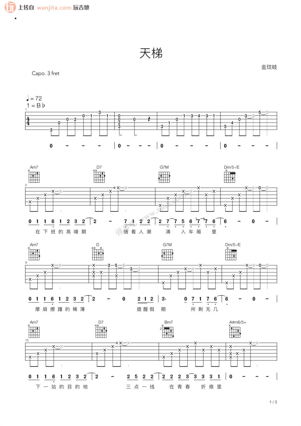 曲谱介绍: 《天梯》吉他谱,总共3张高清图片谱,选用Bb调指法,速度每分钟72BPM,弹唱建议使用变调夹夹三品,弹唱难度初级。