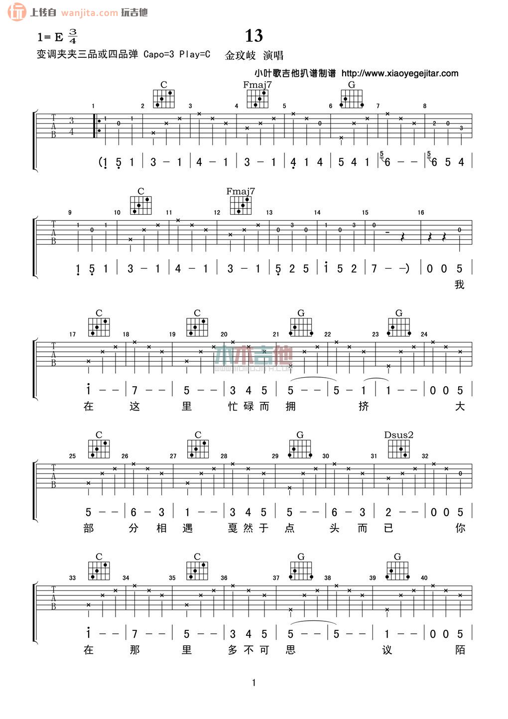 曲谱介绍: 《13》吉他谱,总共3张高清图片谱,原调为E调,选用C调指法,节拍3/4拍,弹唱建议使用变调夹夹三品或四品,弹唱难度初级。
