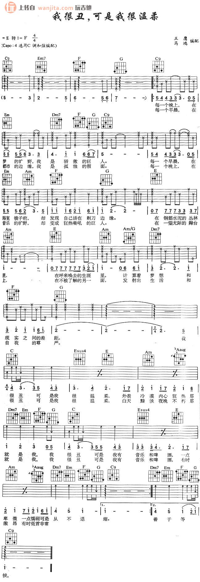 曲谱介绍: 《我很丑可是我很温柔》吉他谱,总共1高清图片谱,原调为E调转F调,选用C调和弦编配,节拍4/4拍,建议使用变调夹夹4品,弹唱难度初级。