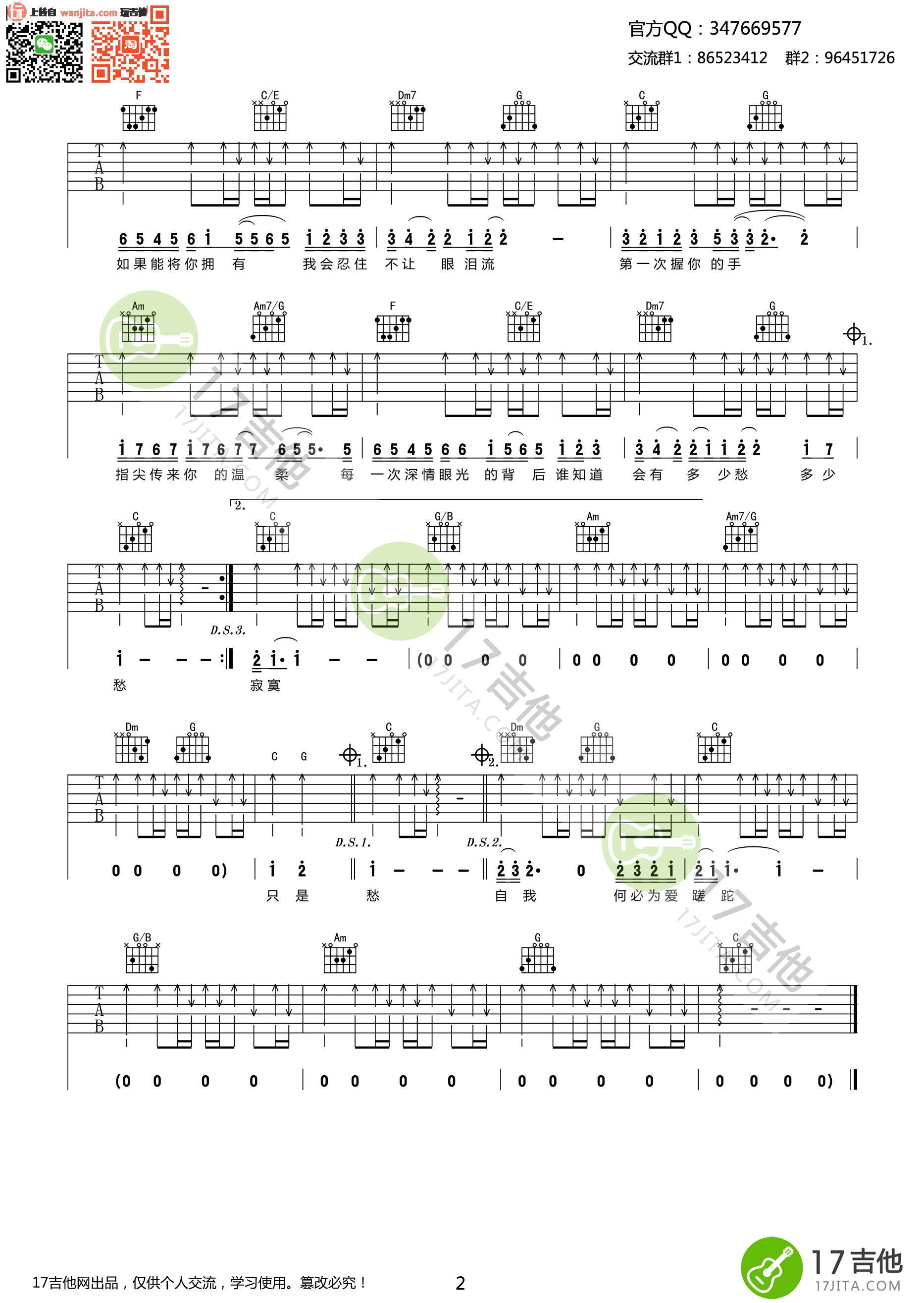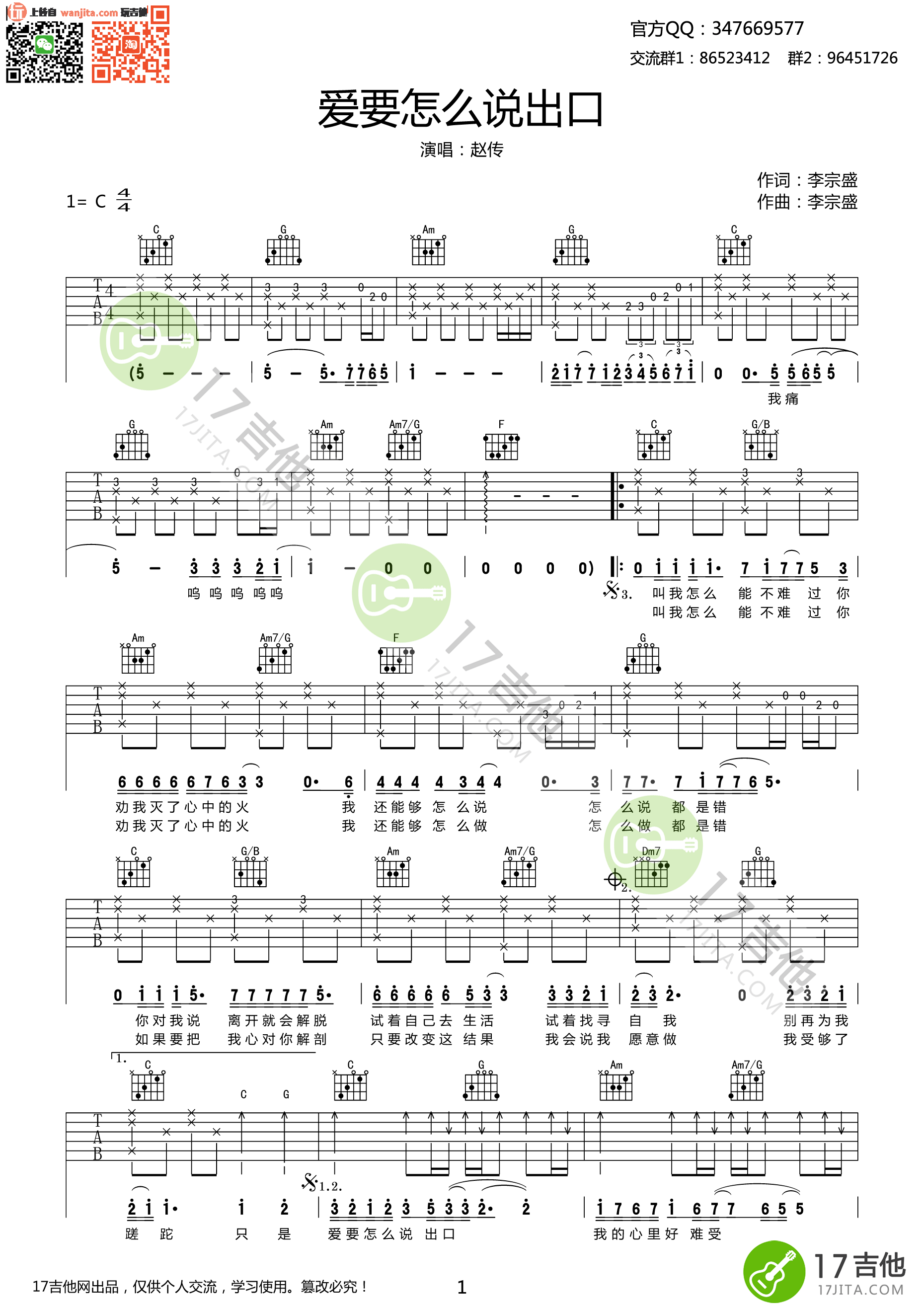 曲谱介绍: 《爱要怎么说出口》吉他谱,总共2高清图片谱,原调为C调,节拍4/4拍,不使用变调夹,弹唱难度初级。