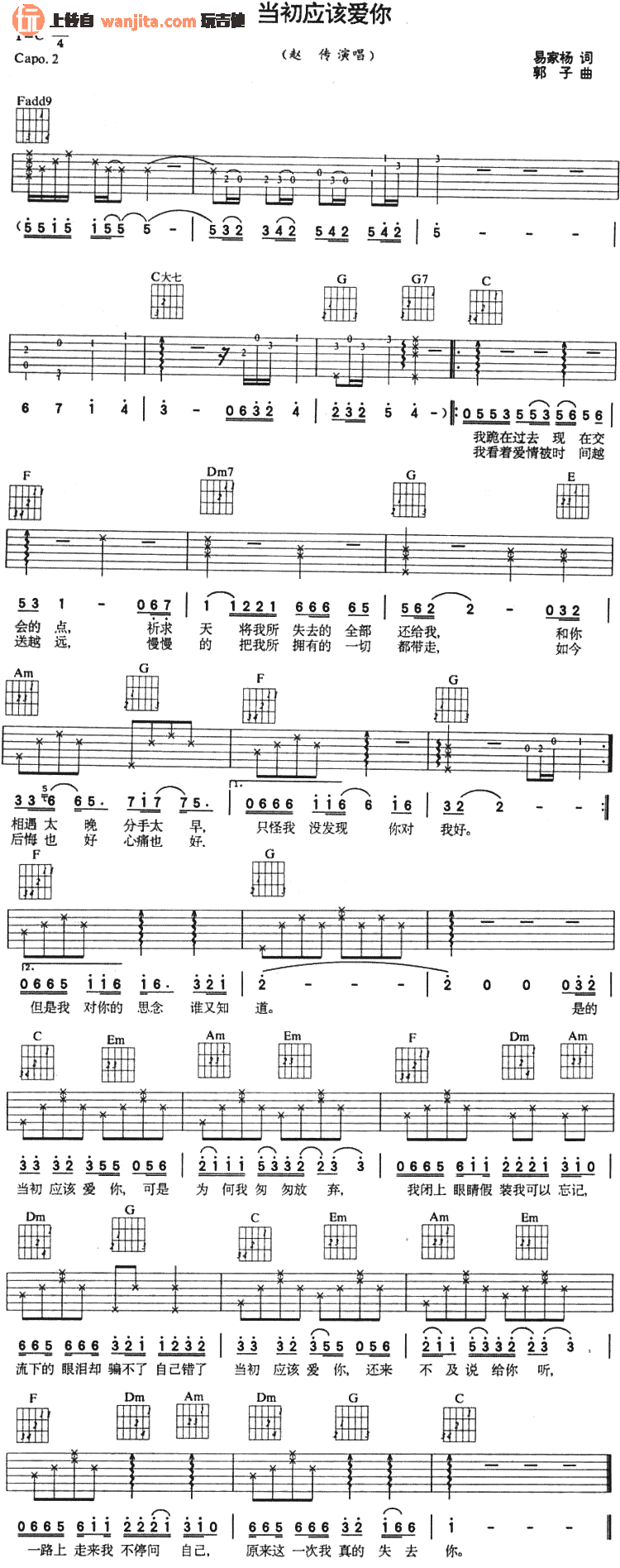曲谱介绍: 《当初应该爱你》吉他谱,总共1高清图片谱,节拍4/4拍,C调指法编配,原调为D调,变调夹建议夹2品弹唱,弹唱难度初级。